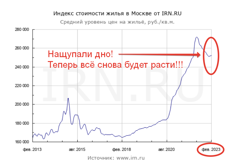 Все сегодня ищут дно в российской недвижимости. И вот уже кое-где его даже вроде бы нашли. Всё, кончилось падение, пошёл рост! Как минимум, в Москве! А она показательна и для всей страны. Смотрите, что на графике стал показывать индекс московских цен от портала недвижимости irn.ru: Лучше будет видно на отрезке в год: Ну всё, "халява-плиз" кончилась! Прошла любовь, завяли помидоры, инфляция сделала своё чёрное дело, пора бежать снова - покупать, покупать и покупать, пока ещё не подорожало! Это я навскидку и своими словами привожу примеры писанины, что теперь во множестве плодится и в ВК, и в Дзене, и в Телеграм. Оказывается, у нас январь был "дно". И не толкьо из-за того, что это месяц провальный, а сам по себе. Ведь уже в феврале всё пошло в рост - смотрите же! Но хочу вас "успокоить" - это ещё далеко не дно. Даже в Москве. На самом деле у нас в целом на рыке, и в Москве, всё хуже, чем думается многим. Но об этом отдельно, не здесь. Здесь только коротко "намекну". В декабре был некий