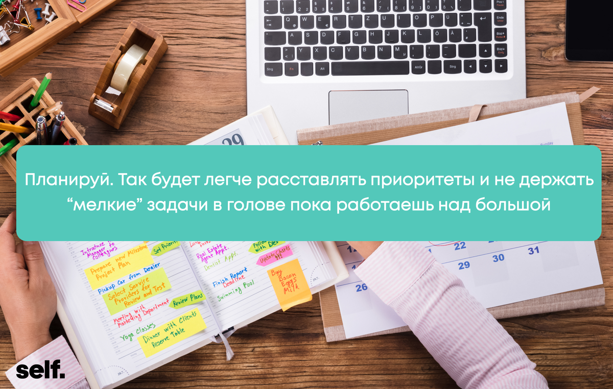 24 часов в сутках не всегда достаточно, чтобы перед сном поймать себя на мысли, что сегодняшний день прошел продуктивно. На работе накопилось море задач и каждая требует глубокого внимания, но ты постоянно отвлекаешься на более мелкие задачи. Телефон разрывается и ты отвлекаешься на постоянные сообщения от друзей, с новостями, рекламой или историями блогеров об их успехах. А пока читаешь сообщение, тебе упало ещё 100500 задач, которые нужно выполнить "ещё вчера". Так что же делать, чтобы успевать выполнять свою работу и при этом не получить выгорание? 1. Планируй Да, планирование задач на день это важный момент, который поможет тебе правильно расставить приоритеты выполнения и ничего не забыть. Не нужно расписывать все строго по времени, достаточно просто написать список дел на сегодняшний день. 2. Разбей слона на бифштексы Если в твоём списке дел появилась крупная задача, то лучше её разбить на несколько маленьких подзадач, которые будет проще выполнить. Наш мозг большую задачу воспри