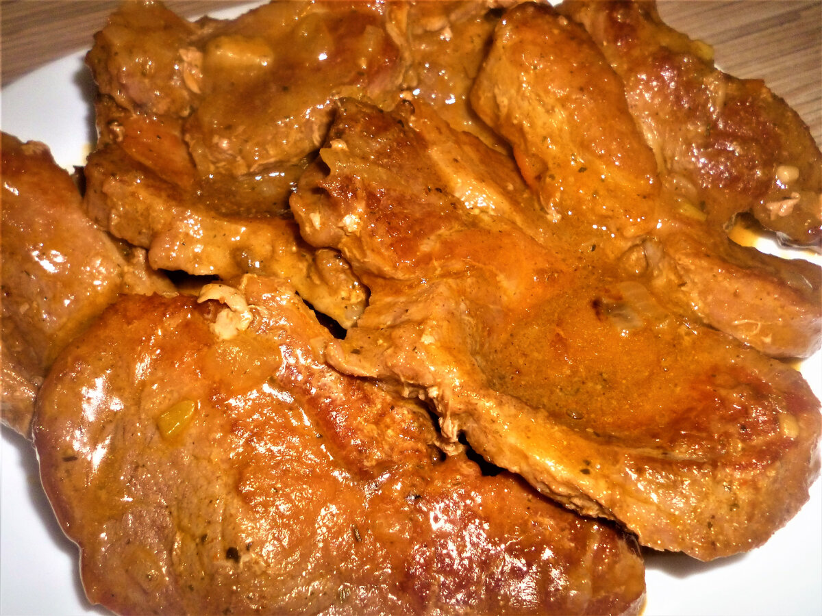 Один из очень любимых мною способов приготовления мяса. Просто, без лишних телодвижений, без отбивания и маринования, без муки и лишних обжариваний на разных сковородах. Можно использовать любое мясо, лишь корректировать время тушения. Мне доводилось так готовить телятину, куриное филе, свинину. В данном рецепте - свинина. Это мясо понравится тем, кто не любит томатную пасту в подливах (у моего мужа в последнее время такие "задвиги"), но любит аппетитный, красивый цвет блюда. Мясо получается мягким и ароматным. Красивые ломти можно подать и на праздничный стол в качестве горячего блюда, а можно приготовить и на обычный ужин - ведь "делов-то" - всего ничего. Рассмотрите этот рецептик - очень рекомендую! Нам потребуется: Свинина 1кг Лук 3 шт (средний) Паприка молотая 2 ст.л. Соль примерно 1 ч.л. Перец красный молотый 1/3 ч.л. Сушеные травы (на мой взгляд, лучше "Французские" или "Прованские") -1 ст.л. Растительное масло 2-3 ст.л. Приготовление: Мясо нарезаем крупными ломтями толщиной 1,2