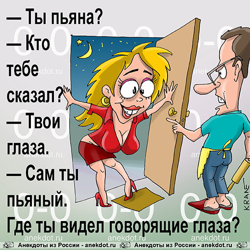 1. - Иногда мне кажется, что мой сын похож на соседа...- Не расстраивайся, возможно, у вас с соседом один папа. 2. - Ты парень. Тебе добиваться. Я девушка. Мне выпендриваться... 3. - Вова, где ты мечтаешь работать?- Я... мечтаю работать? 4. Женщинам на заметку. Если уж довелось ругать матом своего мужчину, делайте это голой, и тогда он особо спорить не станет. 5. Так выпьем же за то, чтобы наступивший год был лучше предыдущего, но гораздо хуже следующего! 6. Пятиклассник Петя Петров, рыдая и теребя, усы, поклялся отцу на знамени в военкомате, что после дембеля непременно возьмётся за ум. 7. Водитель сдаёт свой старый автомобиль в утилизацию и возмущается:- Ну почему современные технологии одновременно позволяют производить бутылки для пива, которые не разлагаются на свалке 100 лет, и кузова автомобилей, которые сгнивают за 3-4 года? 8. В театре спектакль для детей. Момент, где вот-вот должен появиться главный злодей - свет выключен, оркестр тихо тревожно гудит. В зале тишина. И тут так