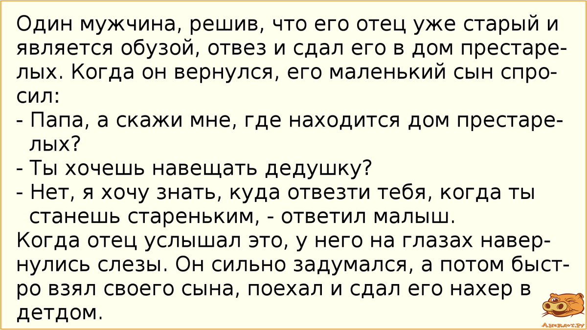 1. - Недавно узнал, что поручик Ржевский не из "Война и мир". Теперь точно нет смысла это читать! 2. Мужик выпил - все забыл, женщина выпила - припомнила все! 3. Жена говорит мужу:- Дорогой, эта ночь с тобой была особенной...- Но я же вернулся пьяный и завалился спать...- Но ты не храпел! 4. Тёща сказала: "Сходи за хлебом". Я ответил: "Хорошо, мама". Я не понимаю, почему она утверждает, что я ответил: "Сама хренач!". 5. Через полгода после свадьбы муж говорит:- А ведь до свадьбы ты была совсем другой! Даже когда я сказал, что зарабатываю 10 тысяч, ты меня похвалила!- Ну, так я думала в долларах! 6. Из-за переменчивой погоды перелётные птицы задолбались летать туда-сюда. 7. У меня кот очень громко мяукает, так хочется, особенно ночью, поставить его на вибрацию. 8. - Микола, а ты в армии служил?- Нет, Богдан, не служил. Меня не взяли...- А почему тебя не взяли?- Найти не смогли... 9. - Алло, здравствуйте. Ваша тёща упала в бассейн с крокодилами.- Ну, и что! Ваши крокодилы, вы их и спасай