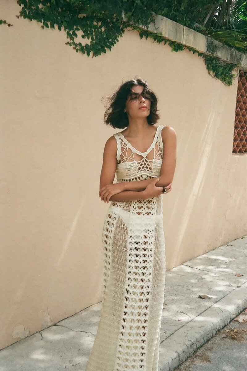 Кроше (crochet) – в переводе с английского – вязание, с немецкого – вязание крючком, а с французского – крючок. Это ажурное вязание необычайно красиво, с характерной воздушной фактурой, в которой множество сквозных дырочек. В течение последних двух летних сезонов платье, связанное крючком, было повсюду. Как предполагаемое возрождение 60-х, оно стало неотъемлемым символом солнечных дней. Долгое время вязаное крючком платье считалось устаревшим предметом женского гардероба. Обвинить его в этом можно за кустарный вид или слишком кричащие цвета... Две причины, которые объясняют его возвращение сегодня, не говоря уже о многочисленных отсылках к модным дизайнерам 90-х. Короткое вязаное платье — флагман сезона. Если вязаное платье зарекомендовало себя в нашей гардеробной, то это потому, что оно оставляет тело свободным для движений и может акклиматизироваться как к городским проспектам, так и к туристическим улицам или солнечным пляжам. Покажем вам несколько образов с вязаных крючком платьев,