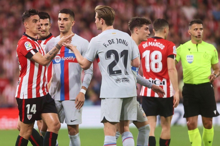 «Атлетик» сравнял счёт на последних минутах, но арбитр углядел спорную игру рукой. «Барселона», победив в Бильбао, сохранила преимущество в девять очков над «Реалом». Через семь дней команды Хави и Карло Анчелотти сыграют на «Камп Ноу». А пока всю неделю будут обсуждать судейство. Испания - Примера. 25-й тур 12 марта 2023, воскресенье. 23:00 МСК Атлетик Б Бильбао Окончен 0 : 1 Барселона Барселона 0:1 Рафинья – 45+1' «Барселона» с первых минут попала под мощное давление переполненного стадиона и соперника. «Атлетик» высоко прессинговал и делал ставку на скорость и удары в атаке, пусть даже в некоторых эпизодах эти удары были совсем неподготовленными. Каталонцы владели мячом (68% до перерыва), но не территорией. Команда Хави искала возможности быстро выходить из-под прессинга хозяев, чтобы использовать пространство на половине поля басков. По-настоящему удачно это получилось, пожалуй, только однажды, за счёт умного движения и подыгрыша Роберта Левандовского, однако момент был упущен. Пол