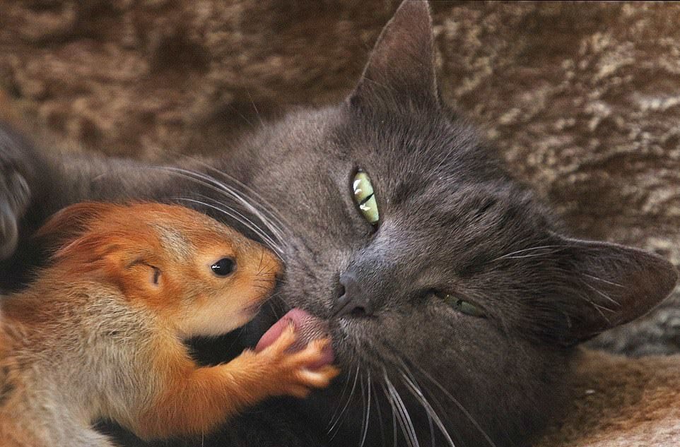 В крымском городе Бахчисарай произошла трогательная история, которая всех удивила и избавила от сомнений о том, что кошки обладают любящим и заботливым характером. Как-то была замечена кошка-мать, которая выхаживала и кормила несколько бельчат. Ее родные котята уже отъелись и повсюду носились, играя друг с другом, а кошка-мать взяла под свою опеку маленьких бельчат и стала выхаживать, как своих собственных. Вид кошки, кормящей бельчат, конечно, необычен, вызывает удивление и приятную улыбку. Явление межвидового вскармливания не является чем-то неслыханным в животном мире. На самом деле, матери одного вида вскармливают детенышей другого вида. Такое поведение часто наблюдается у животных, находящихся в близком родстве, например, коровы кормят телят от других коров или, собаки выкармливают щенков из других пометов. Однако в случае с кошкой и белками, эти два вида не являются близкими родственниками, что делает поведение кошки еще более удивительным. Бельчат кошке принесли сердобольные люд
