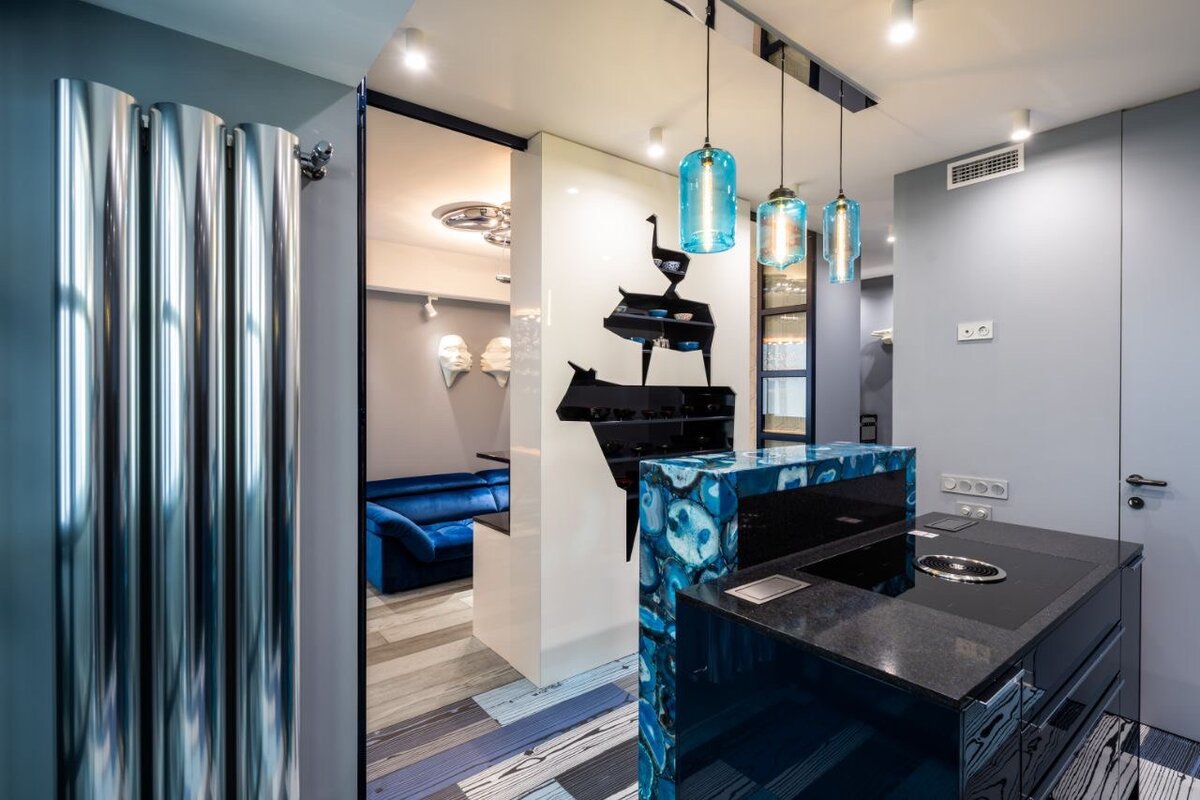 Квартира спроектирована для семьи из 5 человек. Супруги и 3 детей. Как ни удивительно, основной задачей было сделать детскую максимального размера. Важно, что комфорт не был принесен в жертву. Тут есть не только кухня гостиная, но и столовая, а так же 2 туалета. Работать над этой квартирой было огромным удовольствием. Редкий случай когда креативность заказчиков и архитекторов идеально сочетаются, приводит к дерзкому, яркому и необычному интерьеру. Начнем с одной из самых ярких частей- Перегородка разделяющая кухню и гостиную изначально была просто стеной. Нужно было решение, чтобы сделать ее более функциональной и красивой. Дерзкая идея была с восторгом принята заказчиками, напомнила бременских музыкантов и увела весь дизайн в сторону поп-арта и смелых решений. Дерзкие идеи полились рекой, и было принято решение на раковину в маленьком туалете посадить "секретаршу" для чего был выбран нужный образ, и доработан до некоторых портретных средств с одним из членов семьи. В прихожей тоже не