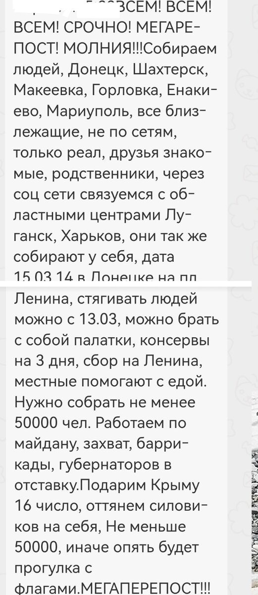В начале хочу дать ссылку на статью про 11 марта, она волшебным образом забанена, модераторы пока молчат. Там тоже есть интересные моменты. Кстати, канал, где нас оскорбляют и называют ватниками, так и не забанен Так как рассказать есть что, то первую часть хроники решила выпускать утром, а вторая, как обычно, вечером, чтобы ничего не упустить. Ну, и вместо гимна Да, эта песня появилась позже 2014, но..... Какая разница? Все эти мартовские дни перед референдумом, русскоязычные регионы Украины, бывшая территория Российской империи, активно стали помогать Крыму, вызывая "огонь на себя". Так, например, 14 марта мне прислали в личку вот такое сообщение, чтобы поддержать нас и показать, что восток и юг Украины с Крымом Я давно не заходила в свои переписки и обсуждения того времени и поэтому, когда готовила эту статью, решила посмотреть. Знаете, что поразило? Процентов 70 оппонентов просто испарилось... Кому отвечала, на что, вообще не понятно..... Хроника 14 марта 2014 года И как