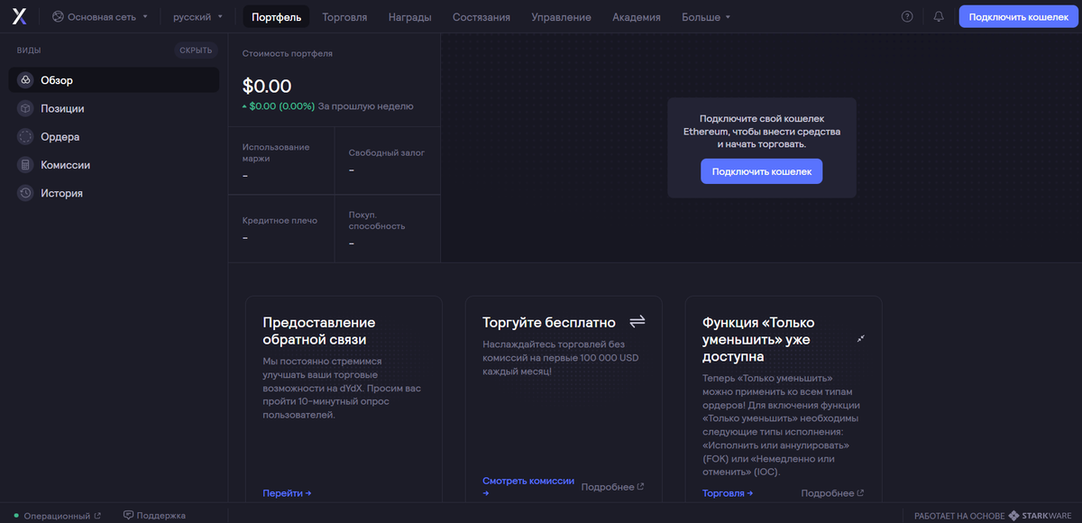 Приветствуем вас, друзья! На связи команда NFT ARTY и сегодня мы подготовили для вас обзор на децентрализованную платформу DYDX. Начало Чтобы приступить к торговле, нам необходимо подключить кошелек. 1.Нажимаем кнопку “Подключить кошелек” 2.Далее нажимаем “Начать работу” 3.Выбираем кошелек, мы рассмотрим на примере Metamask (как создать кошелек метамаск?) 4.Знакомимся с условиями и идем дальше 5.Нажимаем “Запомнить меня”, затем “Отправить запросы”. Во всплывающем окне подтверждаем запрос от биржи. 6.Готово! Теперь можем перейти к операциям. Операции На данной бирже функционал достаточно широк для торговли, однако отсутствует покупка через P2P – вы торгуете средствами из подключенного кошелька. Портфель В этой вкладке вы можете мониторить свою криптовалюту, а также незакрытые сделки, на скриншоте мы видим пункт “Обзор”. Позиции
