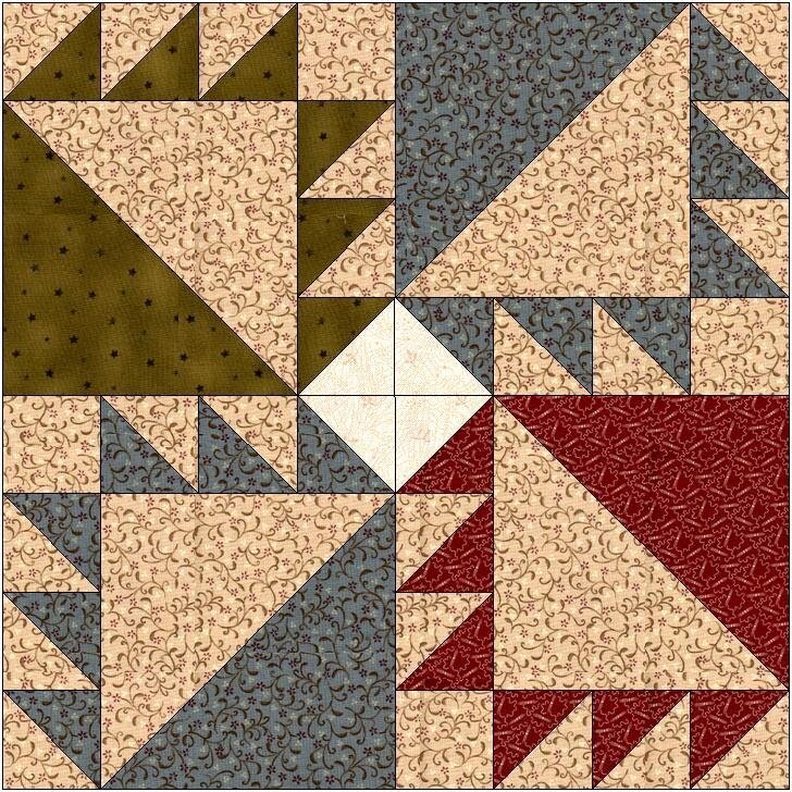 Нашла я этот блок под названием Kansas Troubles Variation - что-то типа Вариация проблем в Канзасе. Размер всех блоков в готовом виде 16"или 40,5см. Припуски стандартные 1/4" или 0,6см. Все предыдущие блоки можно найти в подборке: Ну что, поехали решать проблему... Блок представляет из себя четыре "медвежьих лапы", расположенных по кругу вокруг белого центра (в моих цветах). Для больших треугольников выкраивать будем целые квадраты и резать их пополам. Поэтому будут отходы... Или, как вариант, можно использовать не три, а две цветные ткани. Тогда для раскроя руководствуйтесь данными для ткани голубого цвета. Раскрой: Из голубой ткани: 1 - один квадрат 7" (17,75см); 3 - два квадрата 3" (7,5см); 3 - два квадрата 4.1/4" (11см); Из бордовой ткани: 1 - один квадрат 7" (17,75см); 3 - один квадрат 4.1/4" (11см); 3 - один квадрат 3" (7,5см); Из зелё
