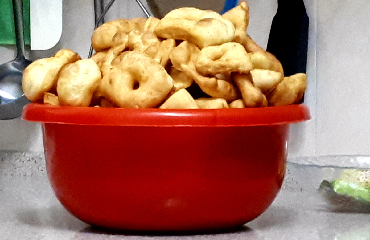Как же вкусно они пахнут, эти только что жареные пончики! Не передать! Нажарила целый таз, не могла остановиться. Процесс жарки для меня почти медитация. Наблюдать как раздувается и румянится в масле кусочек теста доставляет большое удовольствие. Потом сложно остановиться, когда ешь. Рука так и тянется за следующим пончиком. Рецепт бюджетный. Продуктов минимум, а получается целая гора лакомства. Из стакана кефира и одного яйца вот такой таз. Рецепт: Взбить яйца с сахаром и солью, добавить жидкие ингредиенты, соду. Хорошо перемешать. Постепенно добавляя муку, замесить тесто. Муки сколько возьмет, примерно 3 стакана. Оно должно слегка липнуть к рукам. Оставить тесто отлежаться на полчаса. Делала на скорую руку, даже не закручивала. Просто нарезала ромбы, посередине разрез. Поэтому пончики, не хворост. Между прочим, при разном режиме жарки и толщины сочня из одного теста можно одновременно получить пончики и хворост. Например, если раскатать тесто в пласт толщиной 0,5 см и жарить на с