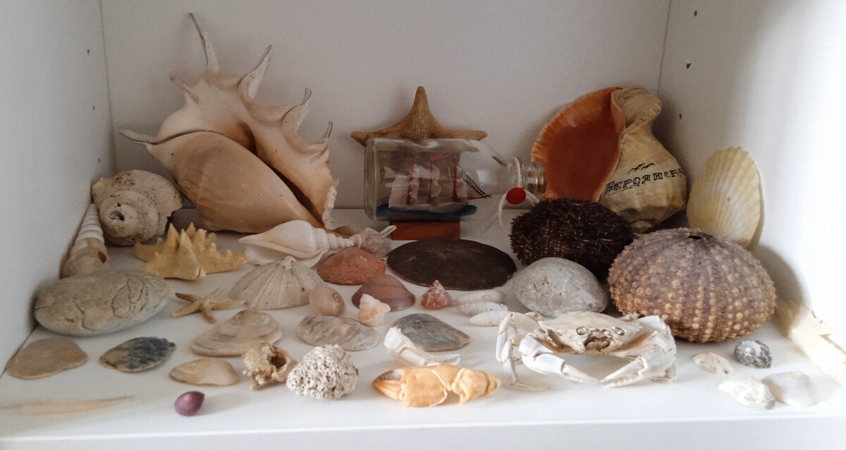 В этом цикле статей будет рассказываться о нашем домашнем музее. В нём собраны наши экспонаты из разных путешествий. Сам музей - это шкаф на 8 полок. Каждая такая полка отдельный зал, в котором собраны наши экспонаты на определенную тему. В этой статье будет описан "Зал Моря". И наверное самым необычным экспонатом в нашей морской коллекции является краб. Его мы нашли на косе Беляус, в Крыму. Лежал он, недалеко от палатки и был уже чуть-чуть высушен на солнце. Он почти полностью сохранился (не хватает только одной лапки). Кроме целого краба у нас есть ещё просто клешня. И она тоже с косы Беляус. Кроме крабов у нас есть большая коллекция ракушек и раковин самых разных видов. Они у нас из разных путешествий. Часть из Сочи, часть из Крыма, часть из Греции и Турции. Все очень разные по форме и структуре. Есть две очень большие, размером с ладонь, а есть крохотные - меньше пуговицы. Также у нас есть небольшая коллекция морских ежей и морских звёзд. Их нам отдала бабушкина подруга. А и