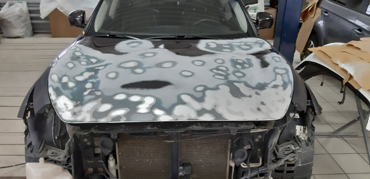 На однократном визите всё не закончилось... Как и было предопределено, владелец INFINITI вернулся ко мне повторно, но уже по другому вопросу... На этот раз, хозяин данного "красавца" вернулся ко мне с просьбой о перекрасе капота и передних крыльев, потому что на этих деталях было "множественное множество" сколов! Глядя на свой автомобиль, с новым, недавно покрашенным и установленным "обвесом", и тут же, рядом капот и крылья, все в сколах и царапинах - вид конечно был контрастный...! Ну для нас это не проблема, красить так красить) В данном случае, в принципе, нет ничего особенного. Стандартная работа по подготовке и покраске. Нужно профессионально подойти к этому вопросу, правильно расточить и расшлифовать все сколы и глубокие царапины, с плавными переходами всех ступеней градации. Непосредственно в местах сколов удалить ржавчину до чистого металла, если таковая имеется. Грамотное перебитие риски и "дело в шляпе". Последующий этап - это нанесение антикоррозионного гру