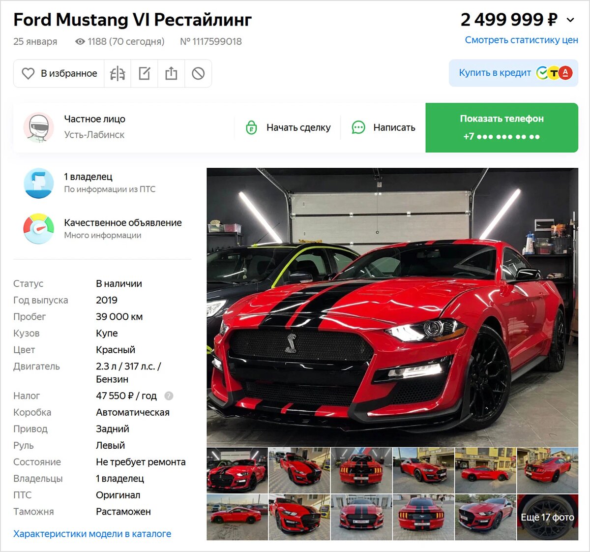 Пробег на тот момент составлял 15,5 тысячи километров, а находилась машина в Ростове-на-Дону. Позже, в начале октября, Mustang появился на Авто.ру — с теми же фотографиями, что и в первом объявлении. Только пробег был уже чуть больше: 18 тысяч километров.