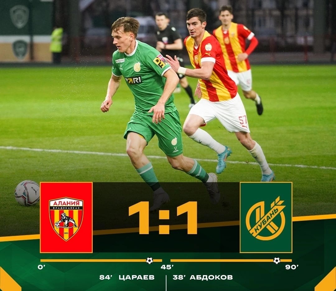 Ничьей закончилась игра Кубани с Аланией На 38-й минуте открыл счёт полузащитник профессионального футбольного клуба Кубань Нури Абдоков. На 84-й минуте игрок футбольного клуба Алания Владикавказ Алан Цараев сравнял счёт в матче. Матч закончился со счётом 1:1. МЕЛБЕТ Первая Лига 2022/2023 22 тур 13 марта 2023 года Алания - Кубань 1 - 1 Фото vk.com/yuvec hipolink.me/yuvec vk.com/yuvec ok.ru/yuvec dzen.ru/yuvec