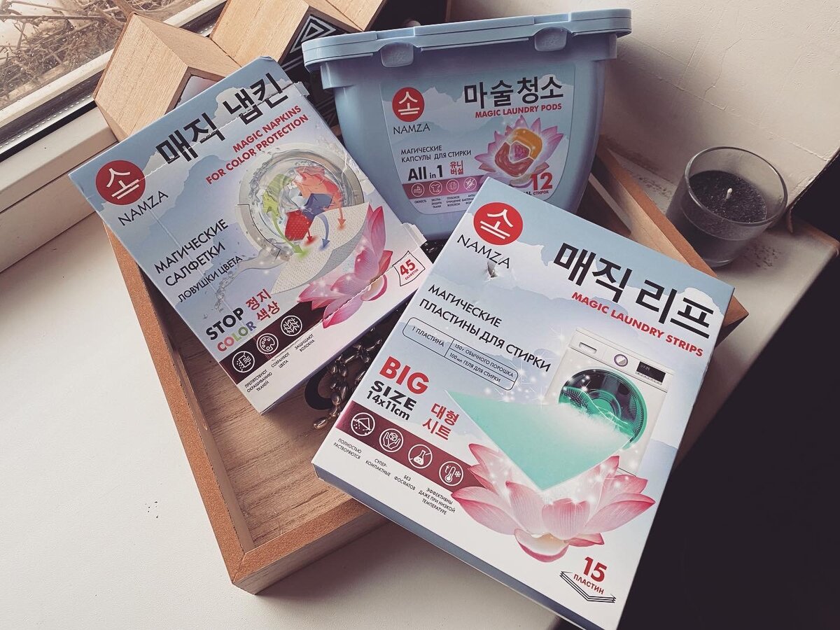 Новый бренд на рынке, Корея и все для стирки! Я уже рассказывала о капсулах «NAMZA» но есть еще два интересных и полезных продукта! Магические пластины для стирки «Универсальные» Big Size - удобная коробка, листы мыльные, с очень приятным и ярким ароматом водяной лилии - отлично подходят для стирки нижнего белья и легких тканей, хорошо смягчает и придает аромат - листы для стирки универсальные, это суперкомпактная альтернатива стиральному порошку и гелю - подходят для всех типов тканей, цветного, белого и черного - полностью растворяются и вымываются из ткани Объем 87 гр Магические салфетки «Ловушки Цвета» - продуманная упаковка, для легкого использования, листы без цвета и запаха - такие листы-ловушки, настоящее спасение, сколько вещей мне они уже спасли - благодаря инновационной структурой работают по принципу ловушек: мгновенно впитывают в себя лишние частицы краски полинявшего белья, предотвращая нежелательное окрашивание во время смешанной стирки Объем 102 гр Количество испо