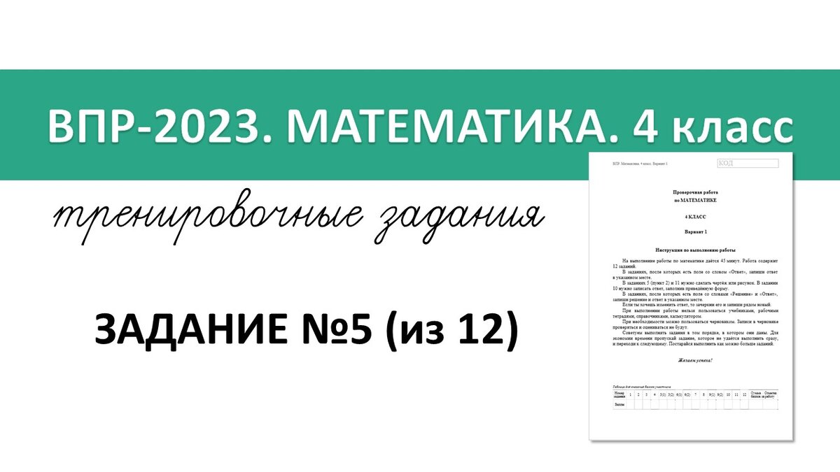 Ранее: Задание 1, Задание 2, Задание 3, Задание 4 ВПР - всероссийская проверочная работа. Ориентировочная дата проведения ВПР для 4 классов: с 15 марта по 20 мая 2023 г. Конкретные даты проведения для каждого класса и предмета школы устанавливают самостоятельно. Математика - обязательный предмет для сдачи в 4 классе. В работе всего 12 заданий, дается 45 минут. Делим 45 на 12, и получаем в среднем около 4 минут на решение одного задания. Я считаю, что этого маловато, так как есть довольно объемные задания. Поэтому на ВПР от ребенка требуется максимальная концентрация, и за счет легких заданий сохранить себе время для решения более сложных. При выполнении работы нельзя пользоваться учебниками, рабочими тетрадями, справочниками, калькулятором. Только черновиком. Черновик не проверяется и не оценивается. У меня на руках 9 тренировочных вариантов 2023 года по математике для 4 класса. В ближайшее время разбираем все задания, а также систему их оценивания. Пожалуйста, решайте тренировочные ва