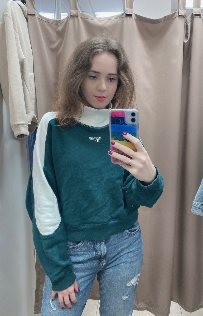 До сих пор себя виню, что пожадничала и не купила эти две вещи. Смотрю на фото и немного грустно, ведь толстовка и рубашка могли быть моими. Уже все мои читатели знают, как люблю ходить по секонд-хендам и искать там интересные вещи. Порой там попадается нечто достойное, что действительно очень хочется приобрести. Например, фирменная толстовка от известного спортивного бренда - Reebok. Состояние идеальное, никаких изъянов нет, как и следов носки. Я даже ни к чему не могу придраться, насколько всё отлично. Если что, то это пятна на зеркале, а не на толстовке. Да и в жизни зелёный оттенок более насыщенный и глубокий, чем на снимке. Я люблю простые и удобные вещи, предпочитаю именно их на каждый день. Понятное дело, чо при наличии повода можно и платье красивое надеть, и блузку с юбкой. А в остальное время предпочитаю максимальный комфорт. Я эту толстовку не купила только по одной причине - меня сильно смутил странноватый ворот. Возникли странные ассоциации с гипсом на шее. Вот не знаю п