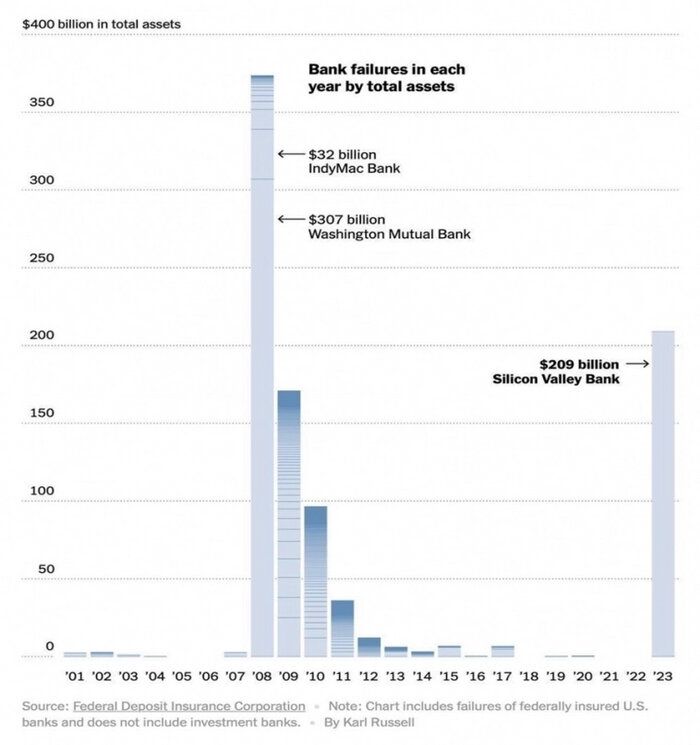 В пятницу топ-16 банк США по размеру активов с треском лопнул. Silicon Valley Bank Занимался финансированием стартапов, которые были очень популярны у инвесторов до недавнего времени. Думаю, все помнят про бум IPO и фантастический рост акций технологического сектора, а также крипты? Всё это происходило благодаря нулевым процентным ставкам в США и вертолётным деньгам, которые власти раздали населению, чтобы те хорошо пережили Covid-19. За это время активы банка выросли в несколько раз и достигли отметки в 212 млрд $. Банк размещал активы в долговые ценные бумаги с длинным сроком погашения. Проблема таких бумаг заключается в том, что если процентные ставки растут, то они приносят «бумажный убыток». Допустим, вы купили облигацию номиналом 1000 рублей. При ключевой ставке в 2% тело облигации стоит 1000 рублей, но вот если ставка начинает расти до условных 4%, то тело облигации переоценивается вниз до того момента, пока доходность этой облигации к погашению не будет равна доходности ключево