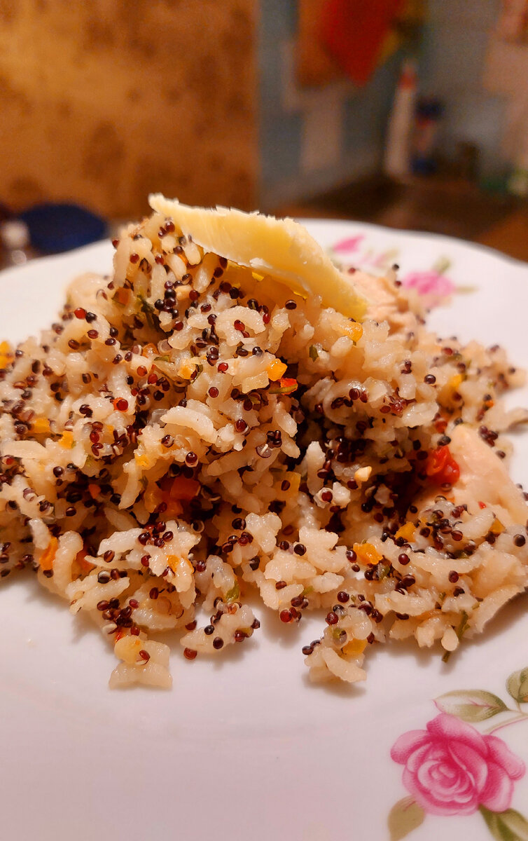 Добрый вечер! Всех, кому по медицинским показаниям, нельзя жареного, приглашаю к столу, на вечернюю кашу) Всё, как мы любим - просто, быстро и вкусно. * Что нужно - Рис белый - половина чашки, Киноа чёрная - половина чашки, Приправа из сушеных овощей ( лук, морковь, паприка хлопьями) - 1 чайная ложка, с верхом, Соль чесночная ( соль, чеснок, кинза) - пол чайной ложки, Филе куриное - 1 шт, Вода - три чашки. Объем чашки - 250 мл. * Что делать - Отмеряем крупу и высыпаем в кастрюльку. Промываем. Добавляем соль, специи. Куриное филе нарезать небольшим кубиком. В кастрюльку добавляем куриное филе, воду и ставим варить. Как закипело - убавить нагрев, прикрыть крышку и варить 20 - 25 минут. При подаче можно использовать сливочное масло ( у меня небольшой кусочек домашнего). Кому масло нельзя, не расстраивайтесь и без него вкусно) Всем приятного аппетита и здоровья!