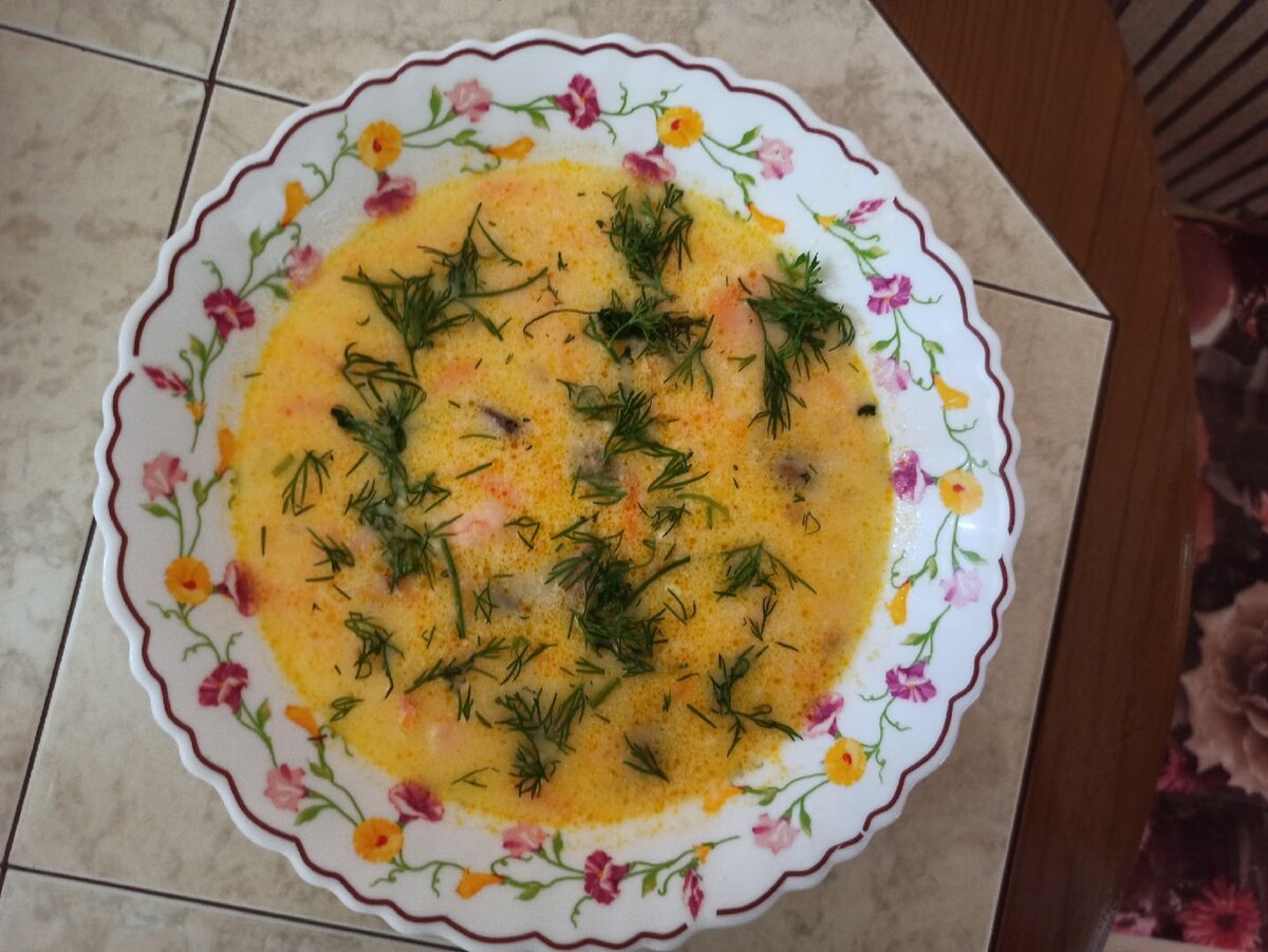 Сырный крем-суп с морепродуктами.
