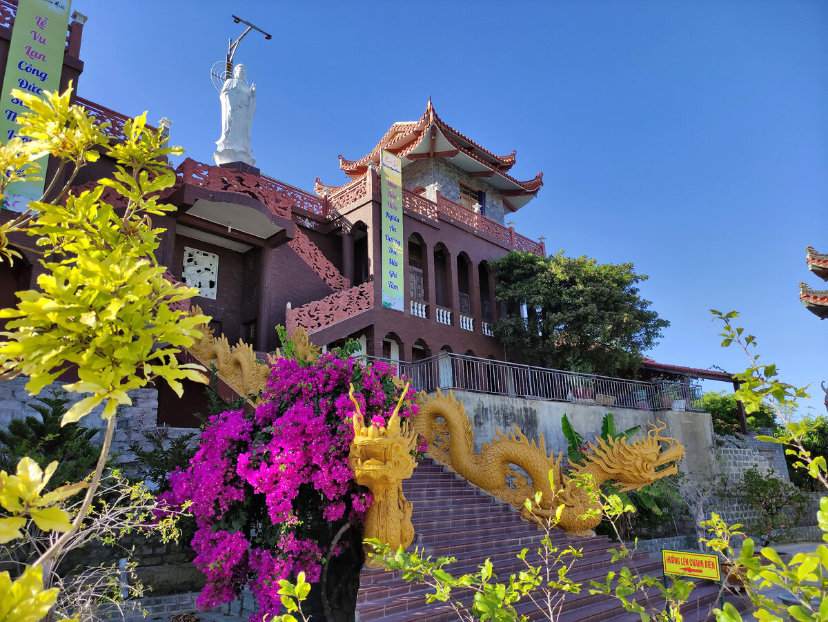 В Фанранге я побывал в рамках однодневной экскурсии из Нячанга. Монастырь на горе Ко Ты, который виден практически из любого района города, был одним из пунктов программы этой экскурсии. Сам Фанранг показался очень тихим, совсем не похожим на Нячанг городом. Тем, кто ценит более спокойный отдых, здесь наверняка понравится. Многоуровневый храмовый комплекс Чунг-шон уходит высоко в гору. Хорошо, что было не жарко, иначе подъём по крутой высокой лестнице дался бы тяжелее. В комплексе продолжаются ремонтные работы, и в некоторых местах лежат строительные материалы, что может расстроить эстетов, но в целом не мешает любоваться резными зданиями и статуями неизвестных божеств. Территория монастыря похожа на цветущий сад, а умиротворяющая атмосфера располагает к спокойному созерцанию. Вознаграждение за долгий подъём — прекрасный вид на весь город. Отсюда можно увидеть и высотные отели, и море, и дома местного населения, и рисовые плантации. Хотелось остаться подольше и насладиться этой звенящ