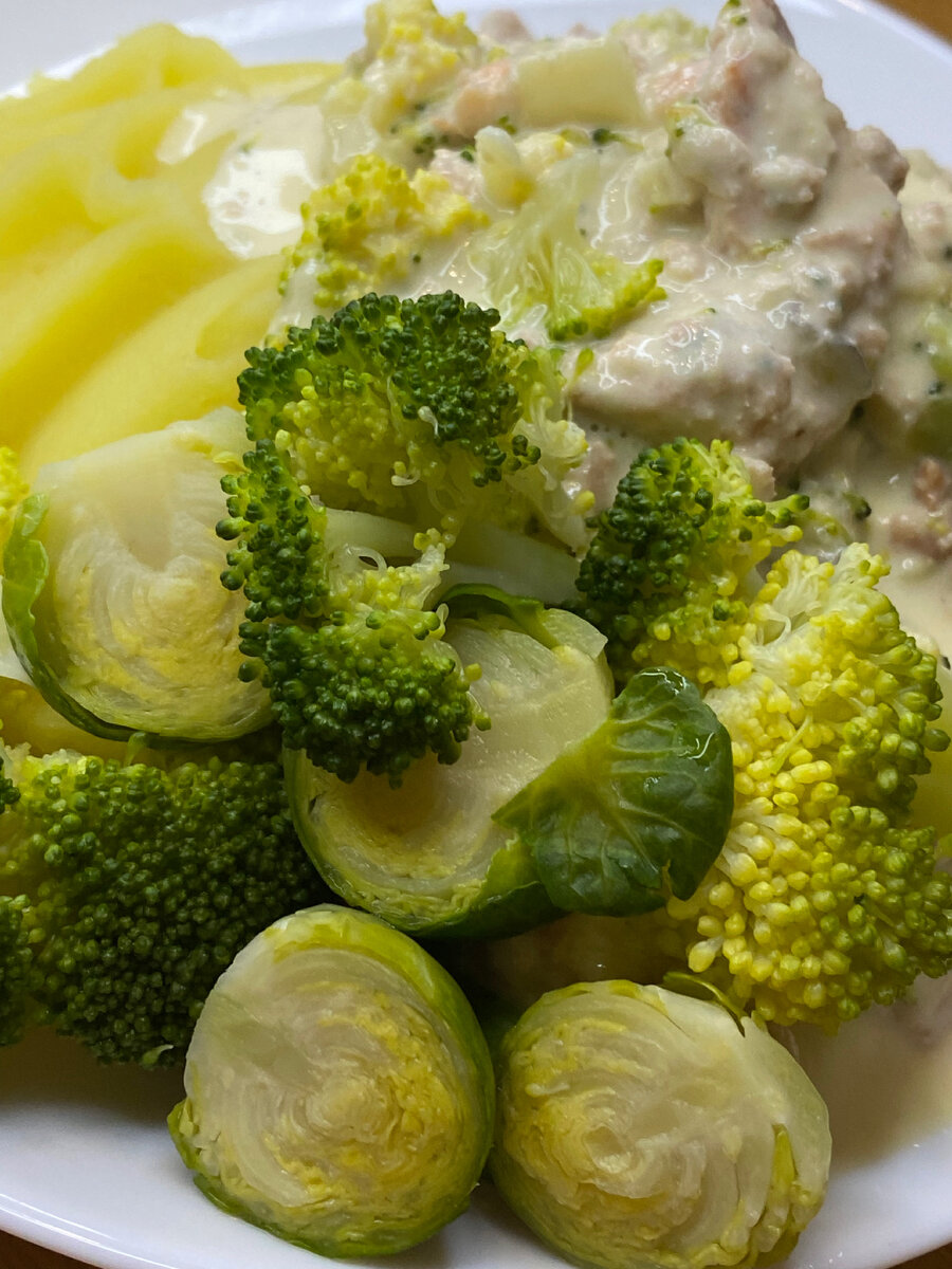 Ингредиенты: Картофель - 1 кг Рыба (горбуша)- 200г Брокколи - 150г Брюссельская капуста - 100г Чеснок - 1 зубчик Творожный сыр - 110г Сыр - 60г Желтки - 2шт Масло сливочное - 40г Соль - 1ч.л. Вода на соус - 100г Вода на пюре (можно заменить молоком) - 1,5-2 стакана ПРИГОТОВЛЕНИЕ: