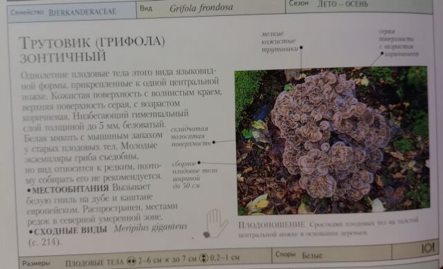 Грибов-баранов превеликое множество. И один из них гриб баран курчавый. Известен он и как грифола листовая и как гриб мейтаке. В справочнике грибном такой гриб разыскался. Правда там он перепутан и назван грифолой зонтичной. Справочник англо-американский. На самом деле эти два барана весьма похожи. Если в молодом возрасте их еще можно отсортировать, так как один похожий на сросшиеся вешенки, этот курчавый, а другой на сросшиеся лисички, это зонтичный, то в зрелом возрасте их почти не различить. Впрочем и тот и другой грибы-бараны находятся в Красной книге. Собирать их и уж тем более кушать категорически запрещено. Гриб ценят в Китае и в Японии. Там его называют лечебным грибом. Но у них каждый первый гриб лечебный, что не удивительно. В Японии этот гриб называют танцующий с гейшами. Гейши его очень любят, прям без него жить не могут. Баран кудрявый разводят и искусственно. На мешках с опилками, прям как вешенку. А вот семена его особо не продают. И есть у меня подозрение, что не спрост