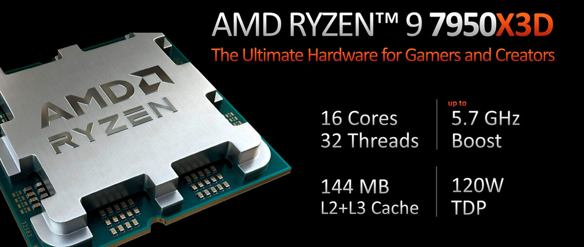 Напомним, от «обычных» Ryzen 9 7950X и Ryzen 9 7900X новинки отличаются +64 МБ дополнительного кэша третьего уровня. Наиболее заметный прирост от технологии 3D V-Cache в играх. Сама AMD называет новые чипы лучшими игровыми процессорами. При том благодаря техническим хитростям и механизмам распределения нагрузки быстродействие в не игровых приложениях не хуже.