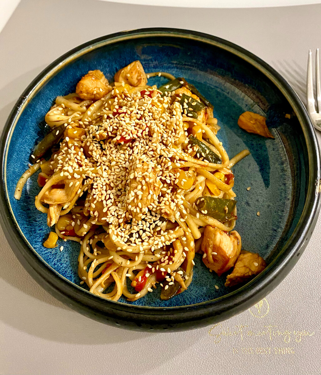 Тебе понадобятся следующие продукты: Готовим курочку: Подготовь овощи: Соедини курочку и овощи: Накрой сковороду крышкой и выключи конфорку Свари Удон Кульминация :) : Подавай к столу: Для удобства используй кухонные щипцы 2. Посыпь блюдо поджаренным кунжутом Устрой вечер Азиатской кухни 🍜 Надеюсь, что тебе будет очень вкусно 😋