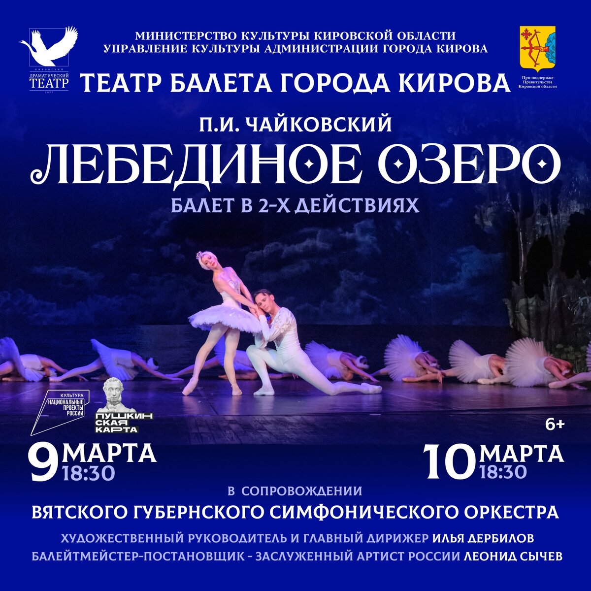 9 и 10 марта 2023 года, на основной сцене Кировского областного драматического театра состоится показ балета «Лебединое озеро» на музыку П.И. Чайковского.