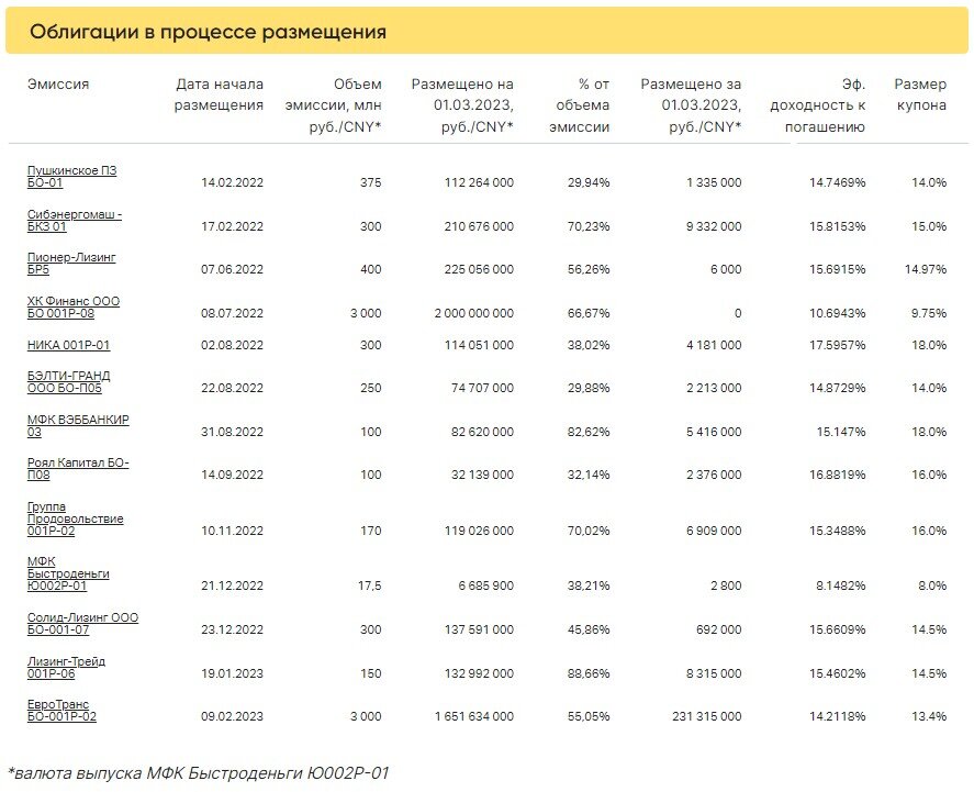 Коротко о торгах на первичном рынке 1 марта новых размещений не было. Вчера на первичном рынке был ажиотаж: спрос на самые ликвидные выпуски увеличился в среднем более, чем в два раза. «ЕвроТранс» БО-001Р-02 собрал 230 млн рублей, а всего с начала размещения 9 февраля 2023 г. — 1,65 млрд рублей из запланированных 3 млрд, то есть размещение перевалило за экватор. «Лизинг-Трейд» 001P-06 собрал 8,3 млн рублей и приблизился к 90% сбору выпуска. «Группа «Продовольствие» 001P-02 привлекла 7 млн, собрав более 70% выпуска. Напомним, рейтинг «Группы «Продовольствие» B+ при ставке 16% (эмитент установил ступенчатую ставку с понижением до 13% к маю 2025 г.), у «Лизинг-Трейда» рейтинг BB+ и фиксированная ставка 14,5% на весь период с погашением в 2027 г. Некоторые инвесторы почему-то считают снижающуюся ставку по купонам чем-то негативным для решения об инвестициях, профессиональные инвесторы же оценивают текущую доходность (по заранее известной конфигурации легко правильно рассчитать доходност