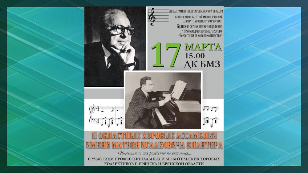 В 2023 году в России отмечается 120 лет со дня рождения знаменитого советского композитора, уроженца города Почеп Черниговской губернии (ныне Почепский район Брянской области) Матвея Блантера. В нашем регионе в память о нем пройдут уже II областные хоровые ассамблеи имени М.И. Блантера. В них примут участие 16 лучших профессиональных и любительских хоровых коллективов Брянска и области. Они стали победителями различных конкурсов в 2022 году: академические детские хоры Городской детской хоровой школы Брянска и детских школ искусств, Брянский городской академический хор, академический хор Брянского колледжа искусств, народные хоры культурно-досуговых учреждений Красногорского, Почепского, Клинцовского и Трубчевского районов Брянской области. Все хоры исполнят песни нашего легендарного земляка-композитора. Также прозвучат произведения известных советских и российских авторов. Ассамблеи откроются 17 марта 2023 года в 15 часов во Дворце культуры БМЗ Брянского областного методического центра