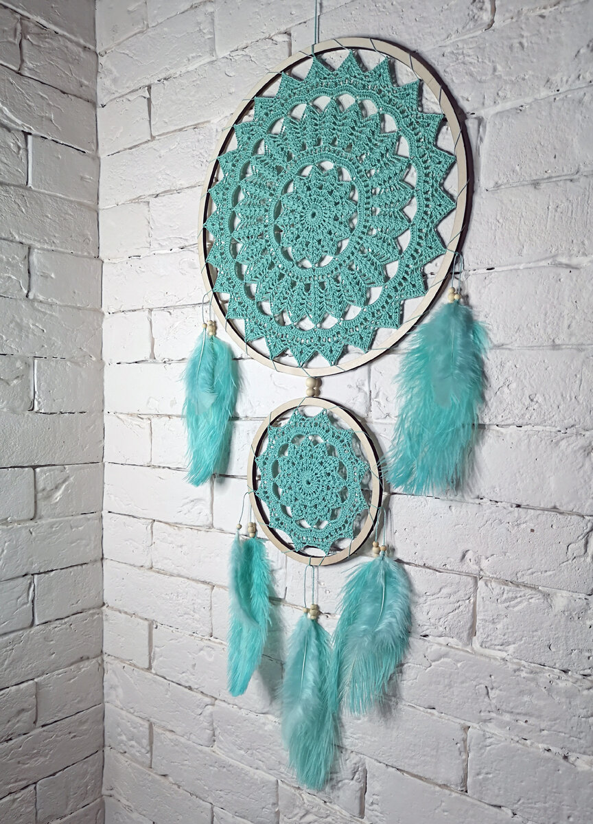 Ловец я вязала из пряжи Alpina «Lily» (50г/175 м), цвет 126. Ушло почти 2 мотка, крючок 1.1. Да, вам не показалось, вязала я плотно. Диаметр большей салфетки получился 30 см, меньшей - 15 см. Набираем цепочку из 8 воздушных петель, замыкаем вкруг и далее вяжем по схеме. Схему я нашла на просторах сети, немного изменила последние ряды, вот что у меня получилось в итоге. Далее, я купила на wildberries: Даю ссылки, если вдруг кто-то хочет повторить в таком же цвете. Потом просто нитку обматывала вокруг деревянной основы, подцепляя салфетку. Между собой они тоже на ниточке, на которую одеты бусины.