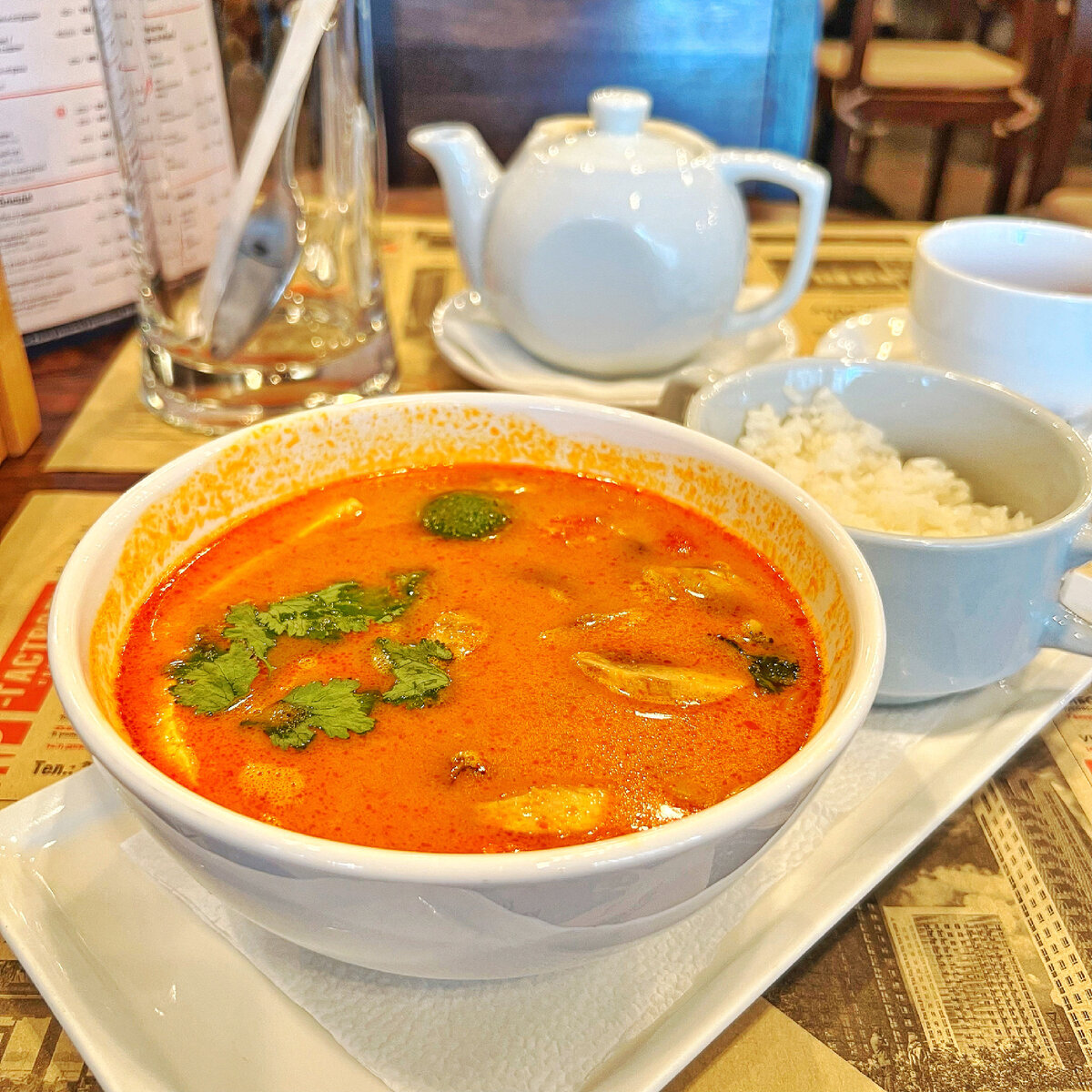 На этой неделе начался Великий пост, а с ним и мои обзоры постных меню в заведениях города. Обычно я начинаю знакомство с постными меню в сети ресторанов BEERMAN и этот год не исключение. Помню времена, когда постные блюда здесь были с витиеватой подачей, но со временем подача стала обычной, что, видимо, более соотносится с поводом. Одно не поменялось — высокие цены. Впрочем, постное меню недешёвое в большинстве заведений Новосибирска. Так сказать, для состоятельных верующих. Взял самое дорогое и экзотическое блюдо. Том Ям с тофу из постного меню ресторана BEERMAN по 590 ₽. Подаётся с рисом. В составе: паста Том Ям, сахар, листья лайма, корень имбиря, лимонные палочки, лук репчатый, перец чили сухой, кокосовое молоко, корень галанга, соль, грибы шитаки, шампиньоны, кинза, лайм, листья лайма, корень имбиря, соевый творог тофу, рис японский маринованный, гриб древесный, томаты. Самое главное в том яме - одноимённая паста. А в отечественной адаптации ещё и кокосовое молоко. Всё остал