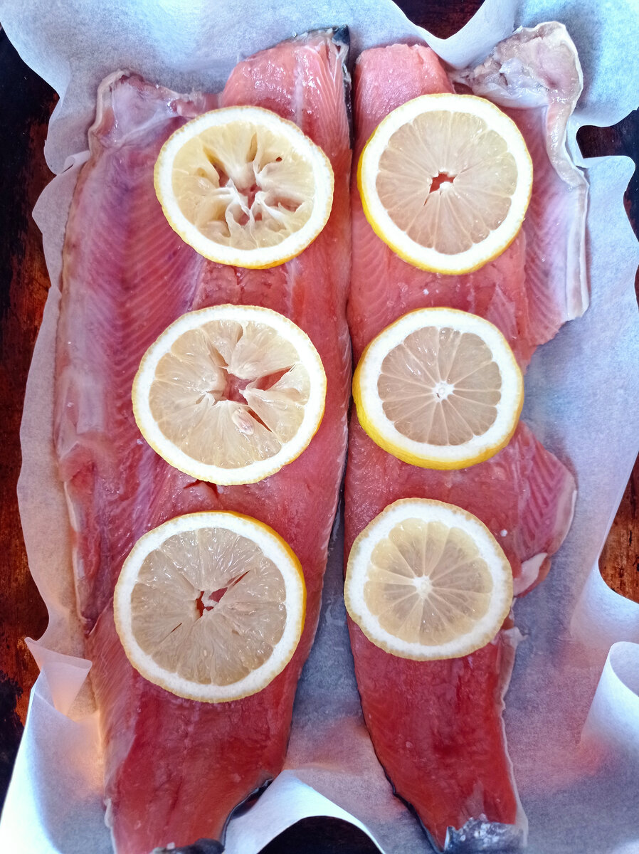 С двух сторон натереть филе солью, смазать маслом, выложить лимон сверху, запекать в духовке при температуре 180 в течение 30 минут.