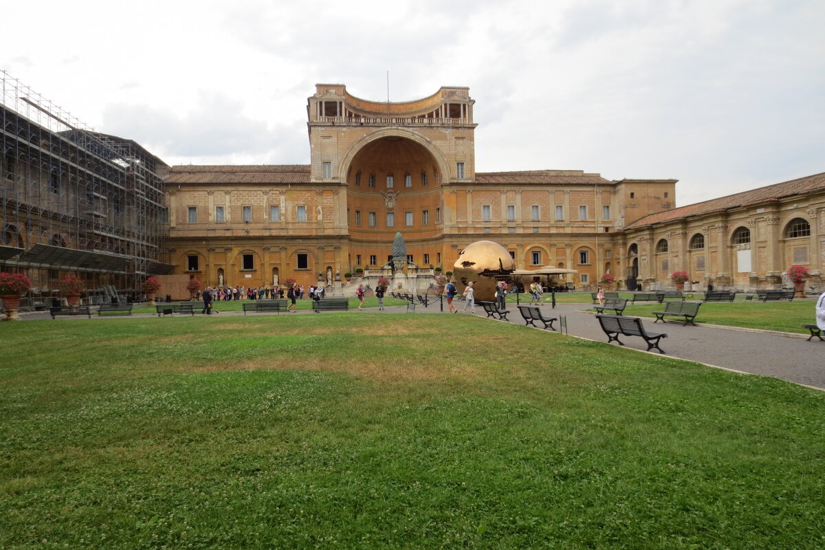 С утра пораньше отправляемся в Музеи Ватикана. Экскурсия начинается на этом обширном внутреннем дворе. Обратите внимание: не "музей", а именно музеи. Это собрание множества произведений искусства, начало которому положил папа Юлий II в начале XVI века. Музеи насчитывают 54 галереи!
