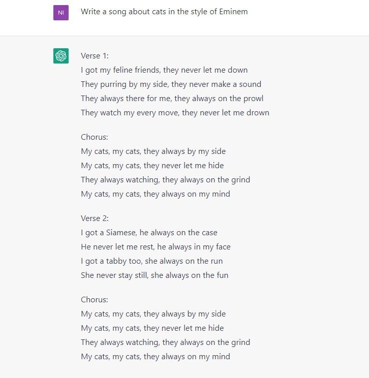 С каждым месяцем энтузиасты продолжают экспериментировать с нейросетями, открывая новые сферы их применения. Если раньше это была генерация красивых артов, то сейчас — сочинения песен и даже озвучивание чужим голосом. Ютубер Grandayy с помощью ChatGPT сочинил текст песни про котов, после чего другая нейронка — Underduck — озвучила трек. Для этого использовался голос рэпера Eminem. Получилось действительно в стиле творчества Эминема, а бит напоминает один из его треков. Осталось лишь гадать, как авторское право будет адаптироваться под современные технологии. Как пользоваться ChatGPT в России, и на что способна данная нейросеть