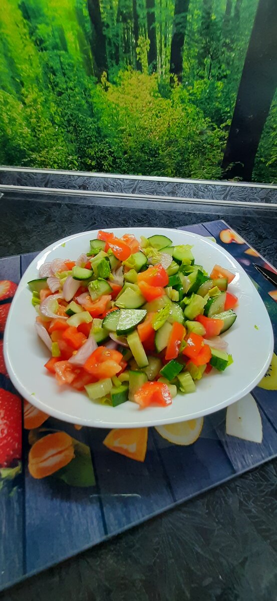 Салат для любителей сельдерея!) Ингредиенты Огурец - 1 шт. Помидорки - 2 шт. Сладкий перец - половинка. Красный лук - 1 шт. Сельдерей 2 веточки. Соль и масло по вкусу. Нарезаем не очень мелко. Солим и добавляем масло оливковое по вкусу! Черешковый сельдерей – это низкокалорийный продукт, включающий в себя: Калорийность на 100 г стеблей составляет 34 ккал, из них: Высокое содержание растительной клетчатки насыщает организм и снижает оличество калорий, которые были употреблены в течение дня. Преимущества Кому стоит воздержаться от сельдерея: Внимательнее отнеситесь к своему рациону! Будьте здоровы! Просто и вкусно! Приятного аппетита!
