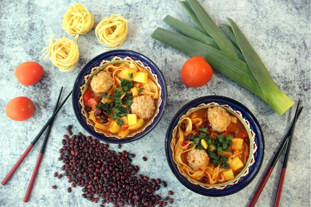 Ингредиенты: Фарш говяжий - 300г Фасоль красная - 150 г Морковь - 1 шт. Лук-порей - 1 шт. Перец сладкий - 1 шт. Картофель - 3 шт. Томатная паста - 1 ст.л. Лапша - 100 г Масло растительное - 3 ст.л. Соль, перец - по вкусу Зелень - по вкусу Лавровый лист - 2 шт. Вода - 2 л Процесс готовки Для приготовления азиатского супа из лапши, красной фасоли и мясных фрикаделек подготовить из списка необходимые ингредиенты. Фасоль я с вечера залил холодной водой, для того чтоб она набухла и быстрей сварилась. Её следует промыть, переложить в кастрюлю, залить чистой холодной водой и поставить на огонь. Морковь почистить и натереть на тёрке. У лука порея отрезать белую часть и нарезать полукольцами. Сладкий перец разрезать пополам, удалить семена, нарезать перец соломкой. Фарш выложить в тарелку, посолить и поперчить, тщательно перемешать. В сковороде разогреть растительное масло, выложить морковь, перец и лук-порей, обжарить овощи пару минут, добавить томатную пасту, посолить и поперчи