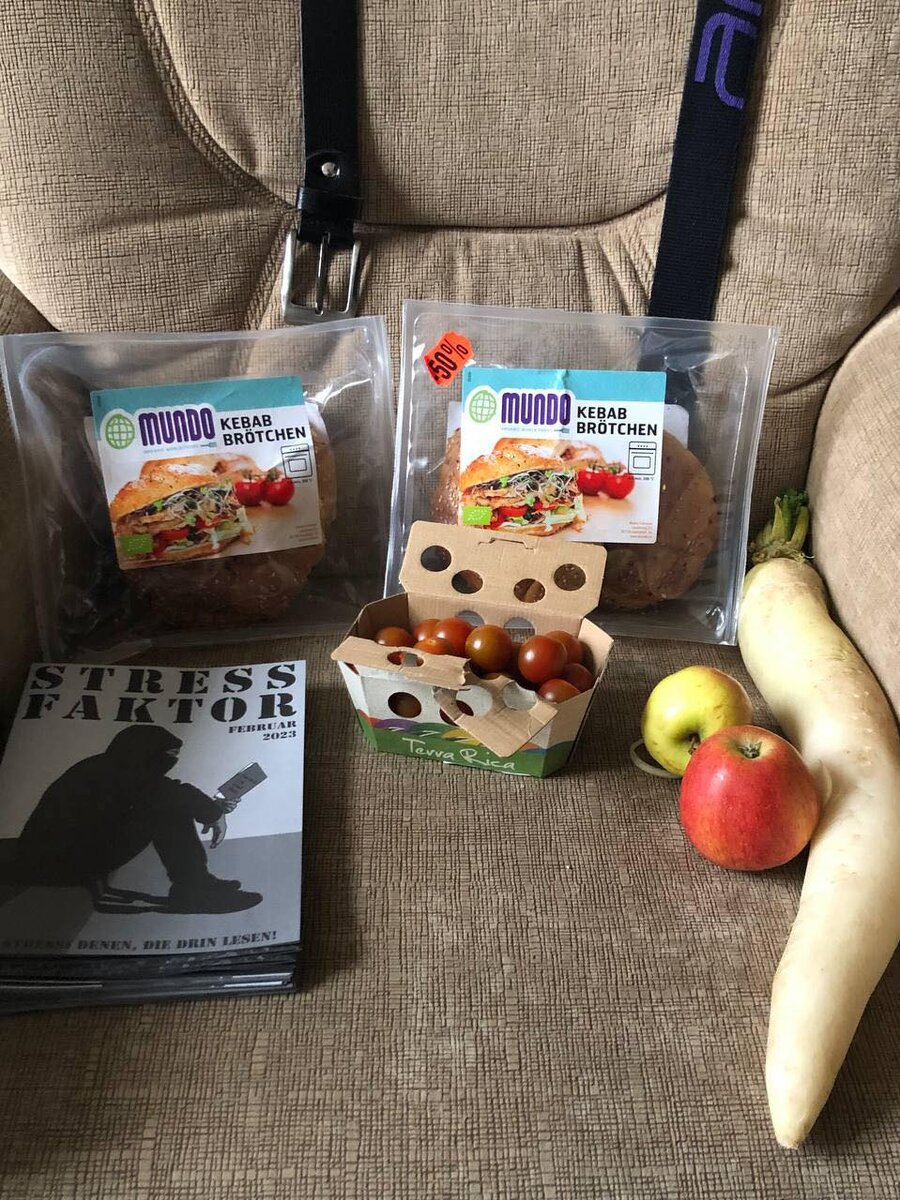 Сегодняшняя бесплатка скромная, но это лучше, чем ничего. Мне достался огромный овощ с гордым именем Дайкон. Придумаю с ним очередной салатик - поделюсь рецептом. Два яблочка - одно подпорченное. Коробочка черри - пойдут на утреннюю яичницу Четыре булочки для кебаба. Никакой кебаб делать не собираюсь, отправлю их на гренки - опытами поделюсь. И стопка никому не нужных брошюр из клуба за февраль месяц. Появилась идея сделать ещё парочку джанк-буков. Один посвящённый Берлину - имя ему ещё не придумалось, второй будет называться: “Сто желаний” с авторскими аффирмациями и, соответственно, желаниями. Один разворот - одно желание. Может быть, придётся разделить на 2 бука… Ну, будет видно…