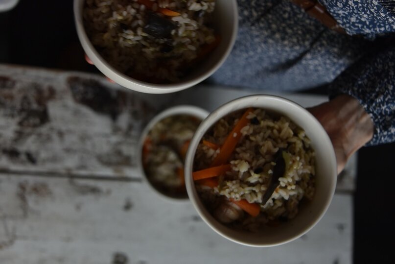 Для плова я брала: Для того, чтобы рис в плове получился рассыпчатым и мягким я готовлю его в казане, или толстой кастрюле, они создают эффект печи, рис закладываю в поджарку, затем только добавляю воду и накрываю крышкой, а после приготовления риса, казан накрываю полотенцами, чтобы он окончательно подошел... У меня овощной плов на русский манер. В казане на кукурузном масле немного обжариваю лук, затем морковку, добавляю баклажаны и рис, все недолго обжариваю, помешивая в течении 5 минут, добавляю специи (перец, зиру и барбарис- они основные), солю и заливаю горячей водой на 2 см выше риса, кладу головку чеснока, накрываю крышкой и готовлю еще около 20 минут. Всегда внимательно слежу за пловом- если выкипает вода, а рис еще не готов, то подливаю еще немного горячей воды. Традиционно плов не мешают. Но на моей практике с пропаренным и неочищенным рисом он и так получается рассыпчатым. После готовности оставляю под крышкой, накрыв полотенцем. Лучше оставить капельку воды невыпаренной,