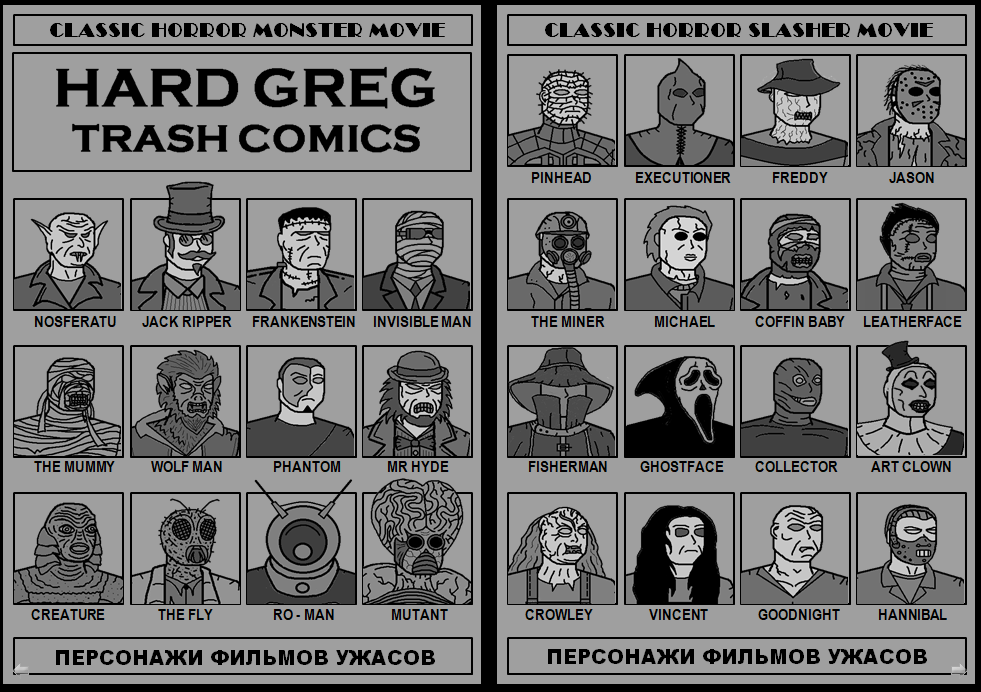 Трэш Комикс Арт - Персонажи Фильмов ужасов Слэ́шер - поджанр фильмов ужасов, для которого характерно наличие убийцы-психопата (иногда носящего маску, иногда обладающего сверхъестественными способностями), который преследует и убивает одного за другим некоторое число людей, чаще всего — подростков, в типично случайной манере, лишая жизни многих за один день. В качестве ранних работ, оказавших влияние на развитие слэшера, критики ссылаются на итальянские картины в жанре Джалло и психологические фильмы, как «Подглядывающий» (1960) и «Психо» (1960). Жанр достиг своего пика в 1978 - 1984 годах - это был «золотой век» подобных фильмов. Известными примерами слэшеров являются «Техасская резня бензопилой» (1974), «Хэллоуин» (1978), «Пятница 13» (1980), «Кошмар на улице Вязов» (1984), «Детские игры» (1988), «Крик» (1996), «Я знаю, что вы сделали прошлым летом» (1997) и другие ... Классические Кино Монстры - Classic Monster Movie Все Журналы доступны для скачивания на стра