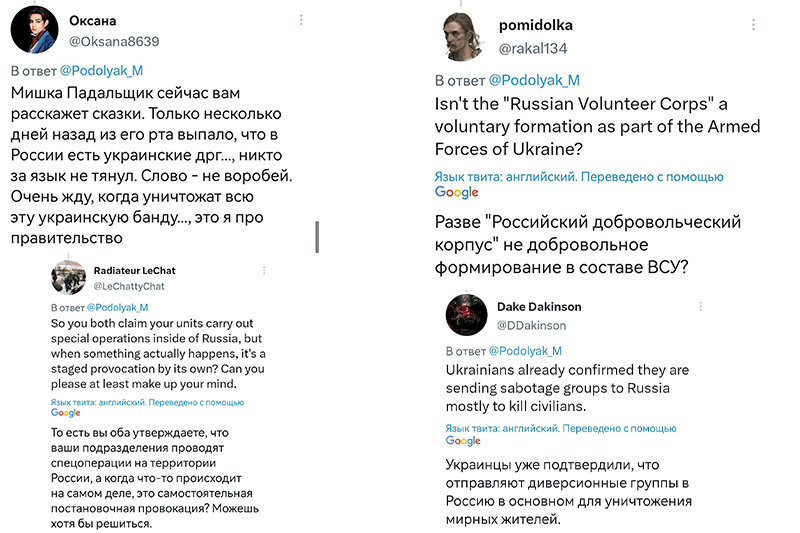 Советник руководителя Офиса Президента Украины Михаил Подоляк в социальных сетях заявил, что история с диверсионной группой Украины в РФ – классическая заведомая провокация. «РФ хочет напугать свой народ, чтобы оправдать нападение на другую страну и растущую нищету после года конфликта. Партизанское движение в РФ становится все сильнее и агрессивнее. Бойтесь своих партизан…», - пишет советник. Пользователи в комментариях просят Михаила определиться, потому что ранее он заявлял, что в РФ есть украинские группировки, а теперь обвиняет в данном происшествии Россию. «Сейчас вам расскажет сказки. Только несколько дней назад из его рта выпало, что в России есть украинские ДРГ… Никто за язык не тянул. Слово – не воробей. Очень жду, когда уничтожат всю эту украинскую банду… Это я про правительство», «Украинцы уже подтвердили, что отправляют диверсионные группы в Россию в основном для уничтожения мирных жителей», - пишут пользователи. В комментариях также напомнили, что Российский добровольческ