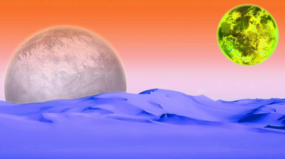 Нас провели по длинному коридору в огромную комнату, в которой по мимо почва находились небольшие летательные аппараты. Открылась огромная дверь, яркий свет. Мы видим планету в первый раз. Идем вниз по пандусу. Нас ждет большое количество местных жителей. Мы видим Большого и Бена. Он выходит вперед и начинает говорить с нами. Другой и Бэн переводит нам приветствие. Большой и Бэн, вероятно является лидером. Он на сантиметров 30 выше остальных. Мы стали осматриваться. Под ногами обычная почва, как и на нашей земле. Подняв глаза, мы видим голубое небо, она ясно и видим два солнца, одно ярче, чем другое. Пейзаж выглядит как пустыня в Аризоне или Нью-мексико Нет растительности, по крайней мере, мы ее не видим. Есть холмы. Наш корабль приземлился на открытой местности с большими структурами, похожими на электрические башни. Рядом находилась какое-то поселение или город. Все здания выглядят как саманные или глиняные хижины. Каждый и Бэн носит на поясе что-то вроде коробки. Странно, но мы не увидели детей. После речи лидера настали приветствовать остальные и Бэн, и они кажутся дружественными.