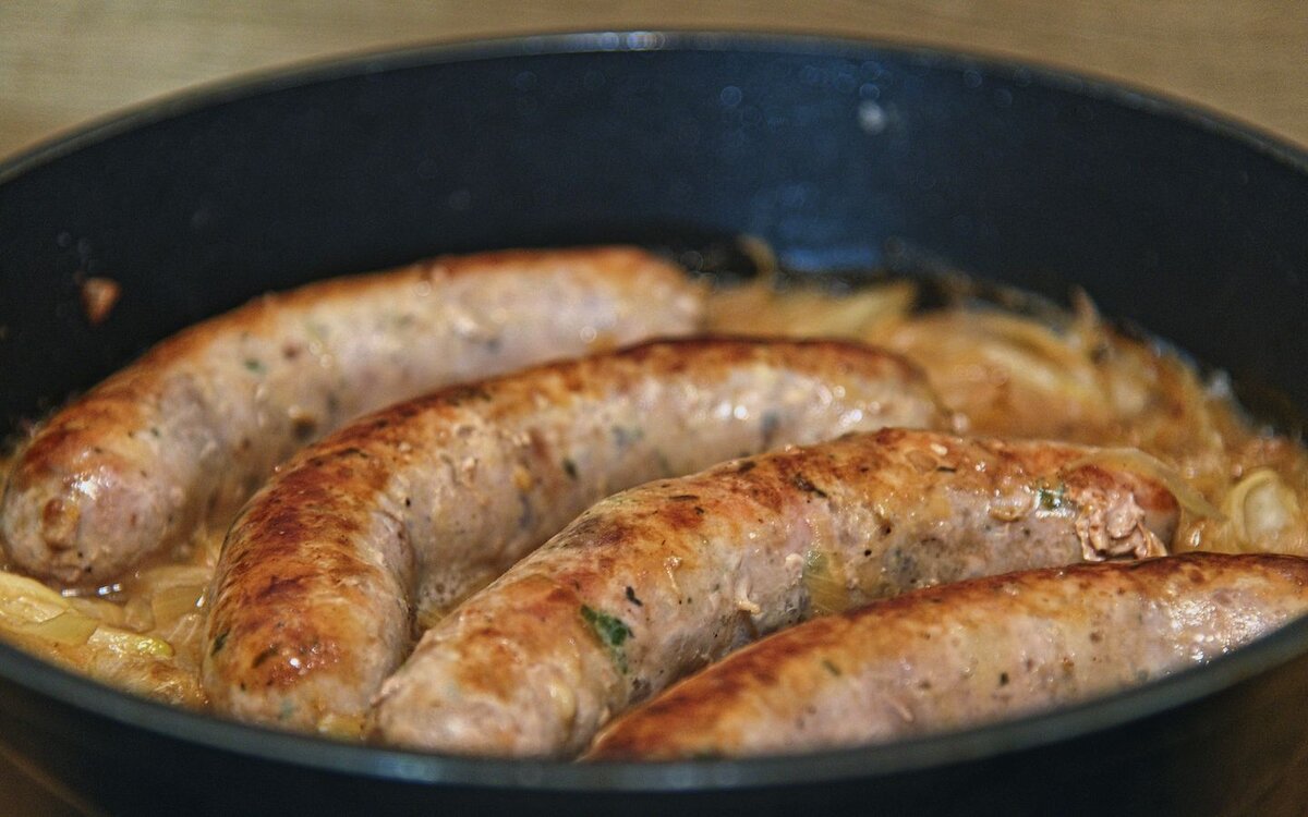 Положите на лук обжаренные колбаски, убавьте огонь до минимума и готовьте без крышки 40 минут, один раз аккуратно перевернув колбаски.