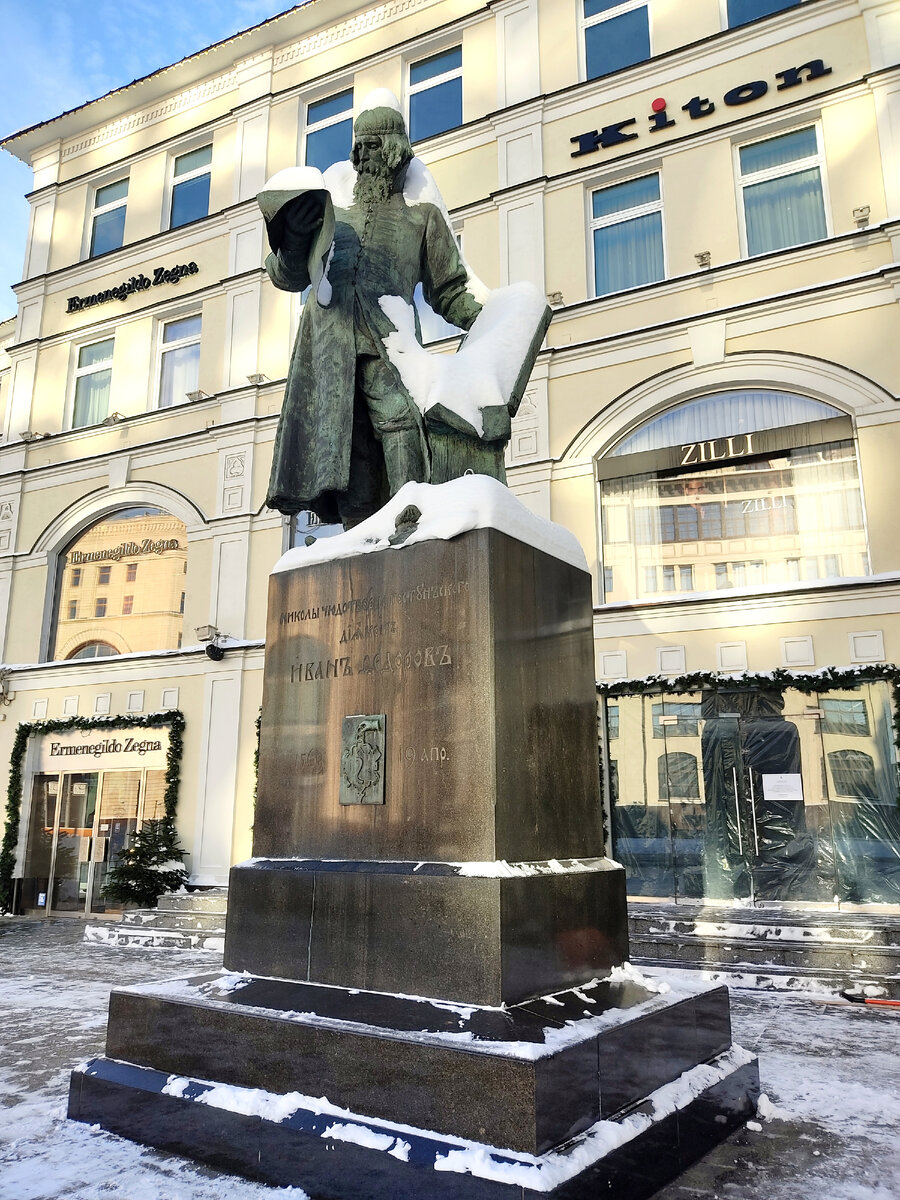 Открыт в 1909 году перед Китайгородской стеной, рядом с Третьяковским проездом. Выполнен скульптором Сергеем Волнухиным по проекту архитектора Ивана Машкова. Памятник неоднократно переносился, с 1990-х годов расположен возле дома № 2 по Театральному проезду. Москва. Иван Фёдоров (в Западной Руси Федорович, Москвитин; около 1520, Русское государство - 1583, Львов, Русское воеводство, Речь Посполитая) - первый русский первопечатник. 1 марта 1564 года в Москве вышла первая точно датированная русская печатная книга «Апостол», издателем которой был Иван Федоров. Также он был основателем Острожской типографии в Русском воеводстве Речи Посполитой «Апо́стол» — богослужебная книга, содержащая: части Нового Завета — «Деяния» и «Послания святых апостолов», — собрание общих и воскресных проки́мнов, прокимнов для особых служб (посвящённых мученикам, пророкам и т. д.) и аллилуиа́риев — отдельных стихов из Псалтири или других книг Священного писания. Книга была издана на французской бумаге тир