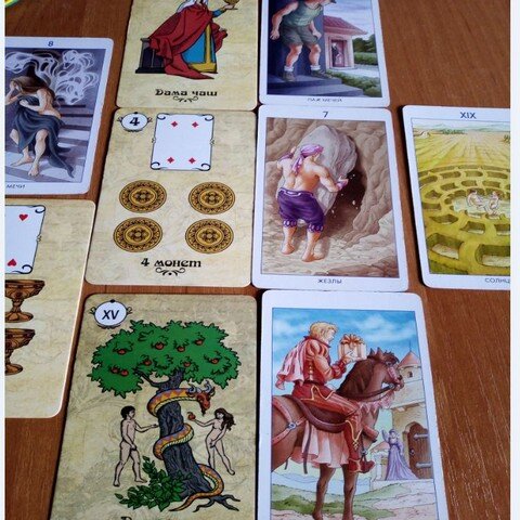 На этой неделе Овны будут действовать немного не в свойственной для них манере. Вы не только выработали реальный план действий, но и проработали стратегию развития своих дел. Начало недели Карта на позицию – Восьмерка мечей Овнов охватывает какой-то внутренний страх. Вы столкнулись с проблемой, в которой не можете разобраться. Незнание того, как справиться с ситуацией, заставляет вас не просто нервничать, а превращается в навязчивую идею, фобию. При этом вам хочется закрыться от проблемы и сбежать, куда глаза глядят. Дополнительная карта Карта на позицию - Четверка кубков Давайте отнесемся к выпавшей дополнительно карте, как к уточняющей. Она говорит, что страхи поглотили ваш разум потому, что вы вдруг потеряли творческое вдохновение. Вас гложет обида, что судьба к вам не справедлива. Из-за этого накатывает апатия, влекущая нежелание бороться. Дела, работа, бизнес Основная карта – Дама кубков Уточняющая – Паж мечей Работа для Овнов на этой неделе станет местом отдыха от проблем. Общени