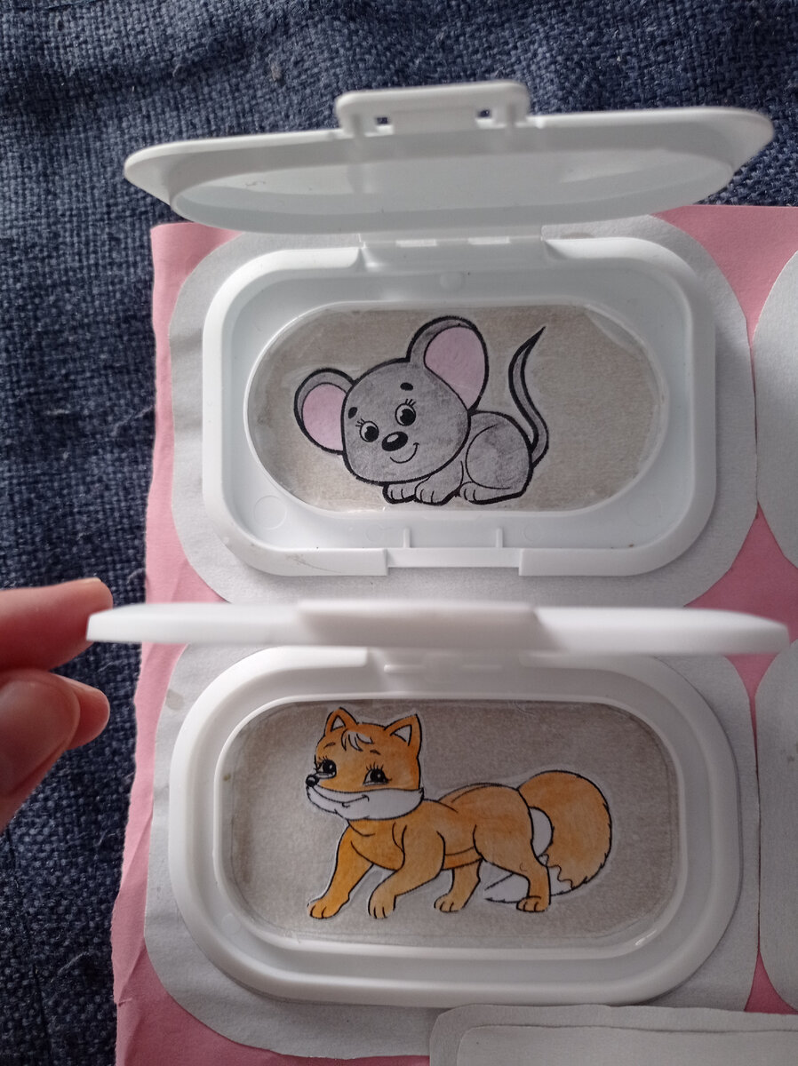 Практически все малыши любят, когда исчезают и появляются предметы в поле зрения. Делюсь вот такой интересной игрой, ваш малыш будет увлечён игрой, открывать и закрывать окошечки. Я использовала крышки от салфеток и картон.