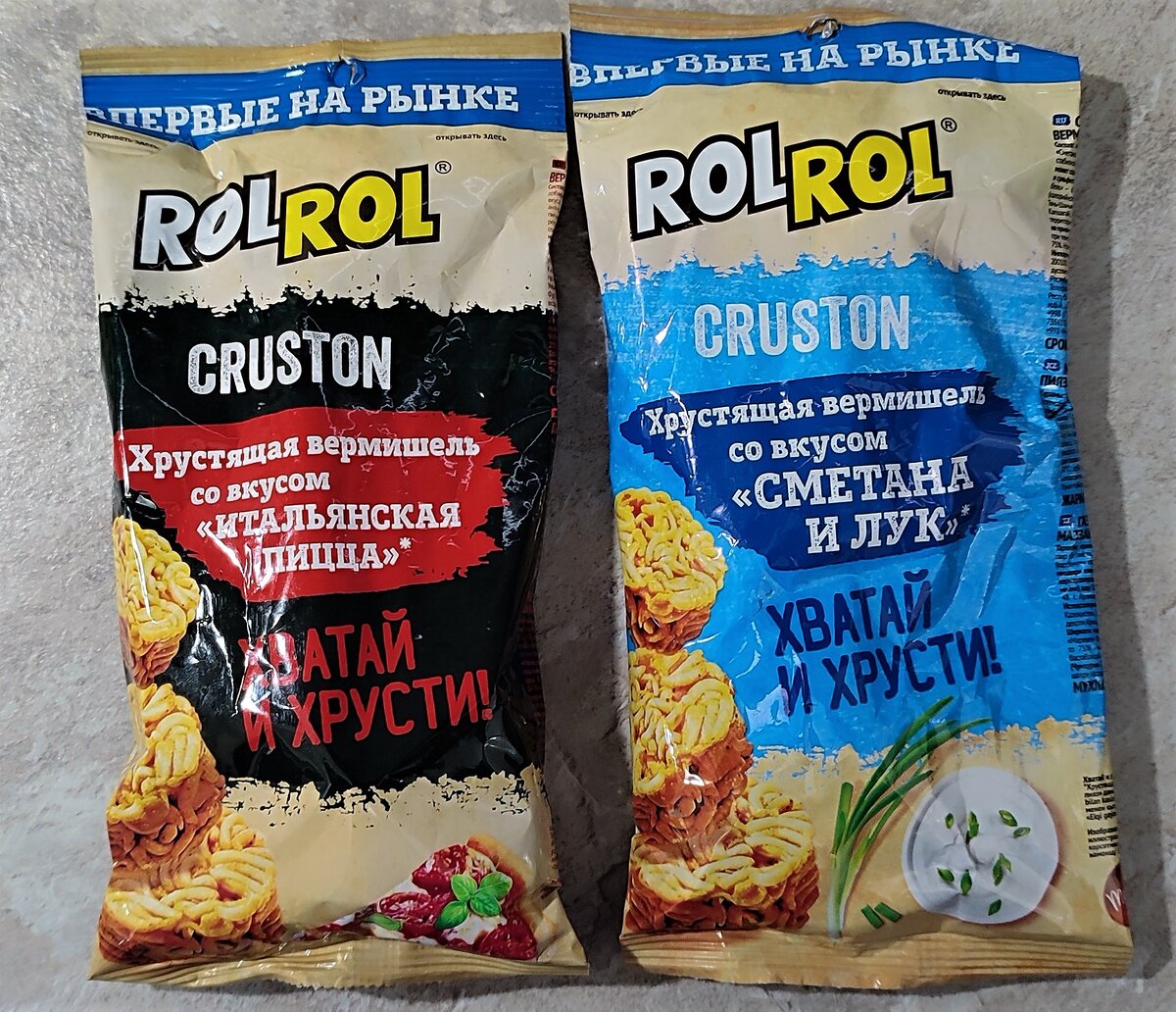 Всем привет! Помню еще в школе многие покупали дешевые БПшки, засыпали специи и хрустели с большим удовольствием. Видимо производители тоже такое ели и решили выпустить такую закусочку для пива или просто для перекуса. Хрустящая вермишель ROLROL со вкусом "Итальянская пицца" и "Сметана и лук". Производитель Роллтон, знакомый по обычным БПшкам. Кстатии не особо вкусным. В пачке 60 грамм, цена 19, 99. В принципе недорого. Состав почти как в привычной БПшке. Радует, что без пальмового масла лапша. Состав одинаковый в разных пачках, разве что различные ароматизаторы вкуса. Вот такие цилиндры из прессованной лапши в пачке. Светлые со сметаной и луком, пожелтее с пиццей. По вкусу как в детстве, только уже в виде готовой закуски. Хрустоны с пиццей чем то похоже на чипсы Читос со вкусом пиццы, достаточно сильно соленые. Со сметаной вкус помягче, но тоже соленые. Просто так не очень ими хрустеть. Под пивко может кому зайдет, вместо приевшихся чипсов и сухариков. Думаю их можно заварить к