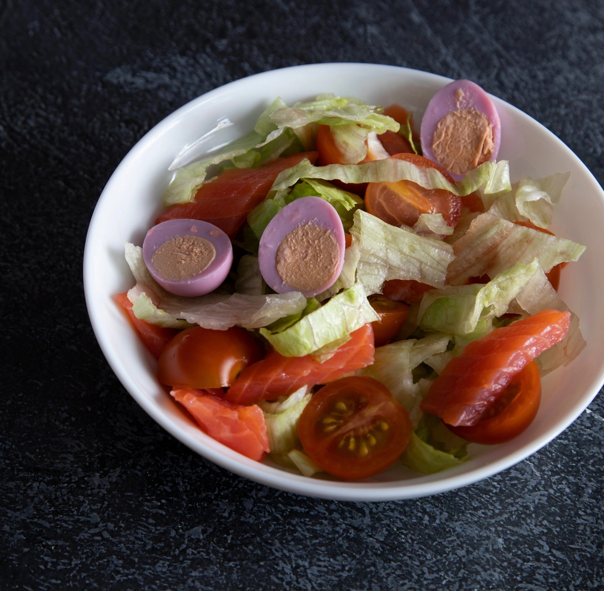 1. Салат промыть, обсудить и порезать произвольно. Разрезать каждое яйцо пополам. Томаты черри промыть и разрезать на 4 части, приправить солью. Семгу нарезать тонкими ломтиками или кубиками.