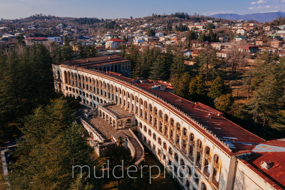 Привет, камрады. Это наверное одно из самых грандиозных сооружений, построенных человеком, что я видел. Честно сказать, периодически играю в игры без компьютера и здесь, пожалуй, круче чем в любой игре. Такие масштабы и мощь дизель-панка. Такого я лично не видел ранее. Санаторий высшего уровня «Шахтёр» был сдан в эксплуатацию 11 ноября 1952 года. Он предназначался для работников Министерства угольной промышленности. Архитекторы Г. Химшиашвили и Г. Мелеги. Санаторий построен в сталинском ампире и является одним из самых красивых и помпезных зданий в Цхалтубо. Вокруг огромный двор, фонтан и зоны отдыха. Фасад изначально должен был быть отделан белым камнем, но Карло Моретти, руководитель строительства, разработал плитку с такими же визуальными характеристиками, которая была намного дешевле, чем белый камень, и в то же время не уступала ей по качеству и внешнему виду.
